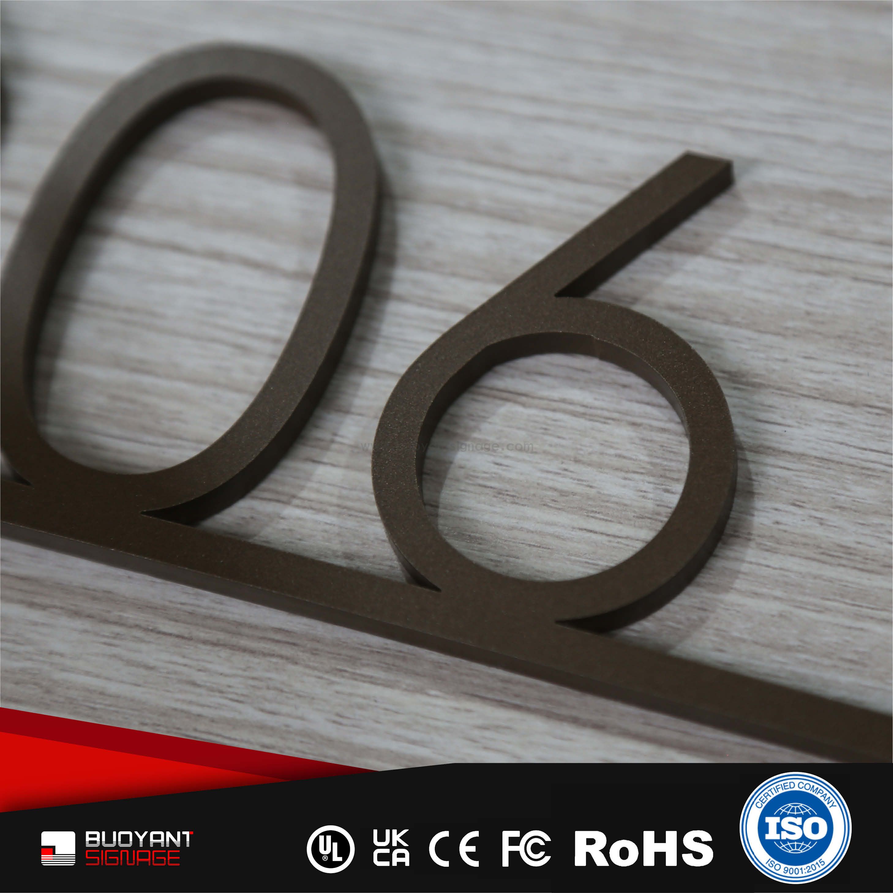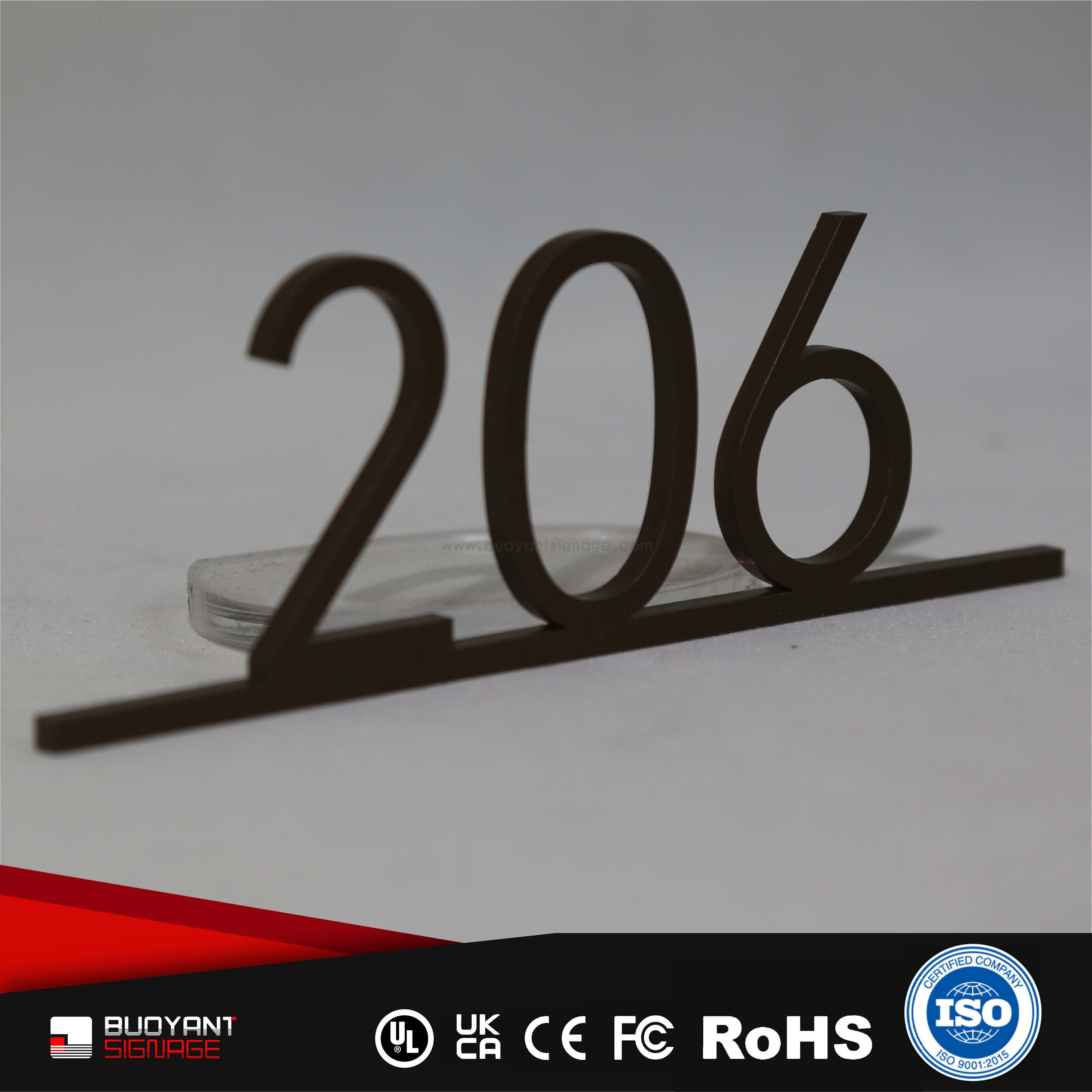 Room number signs are produced using aluminum, acrylic, or stainless steel, supporting bulk and project customization.