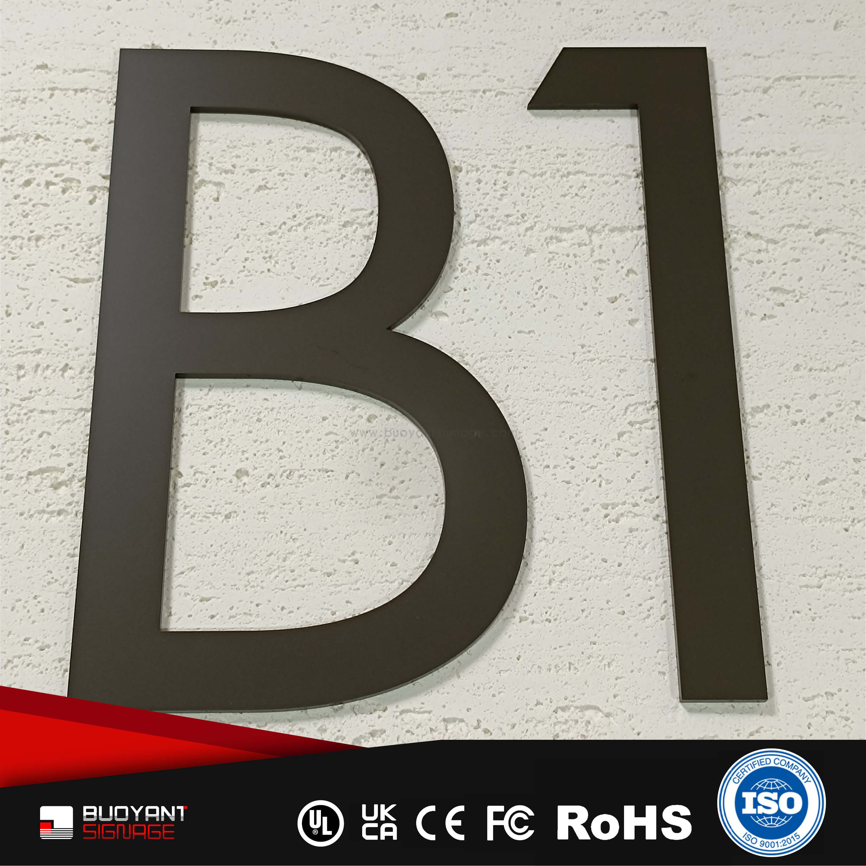 Room number signs are produced using aluminum, acrylic, or stainless steel, supporting bulk and project customization.