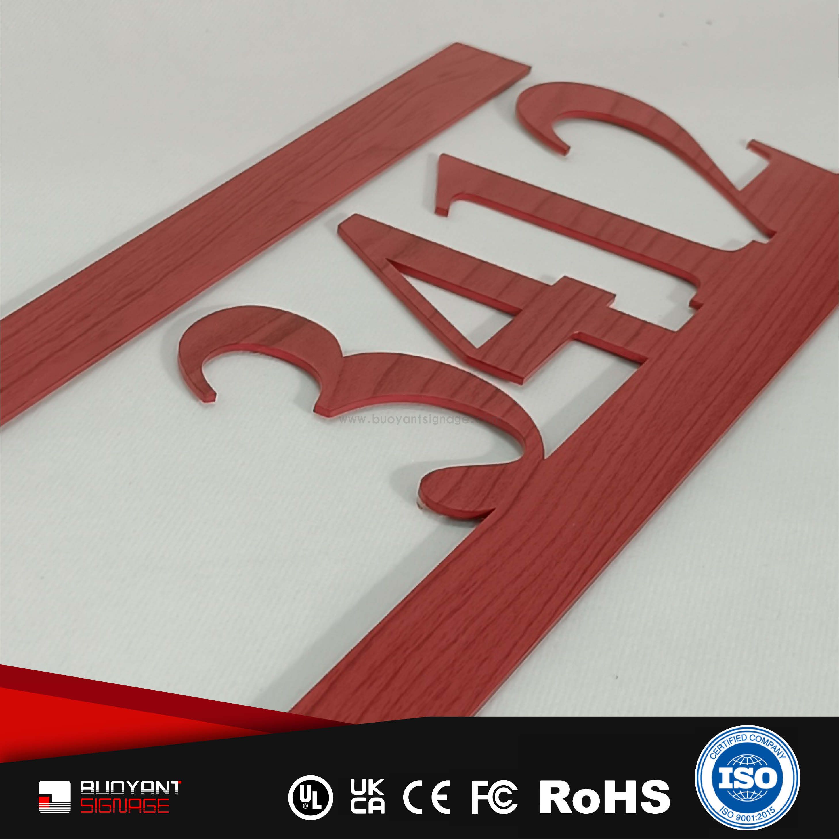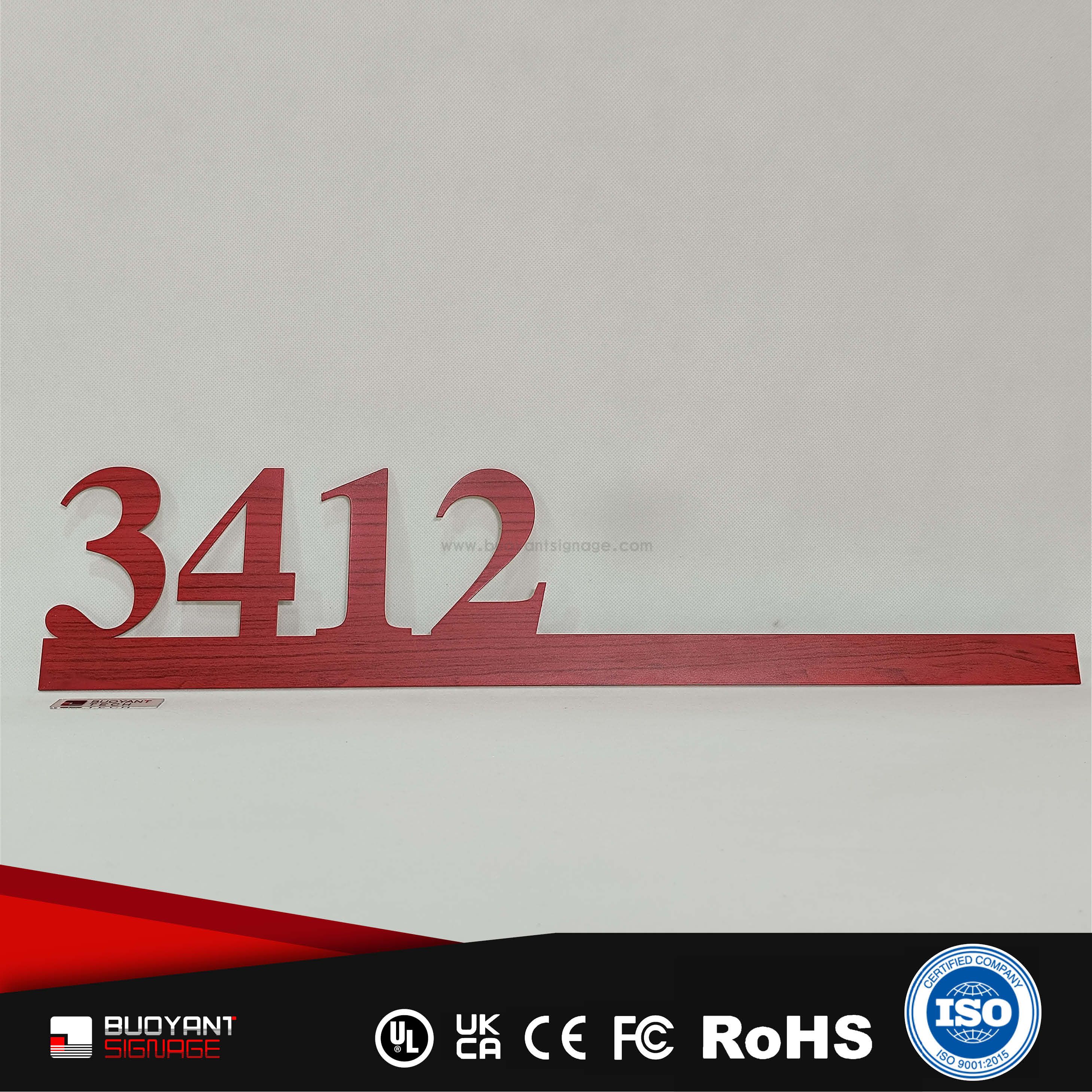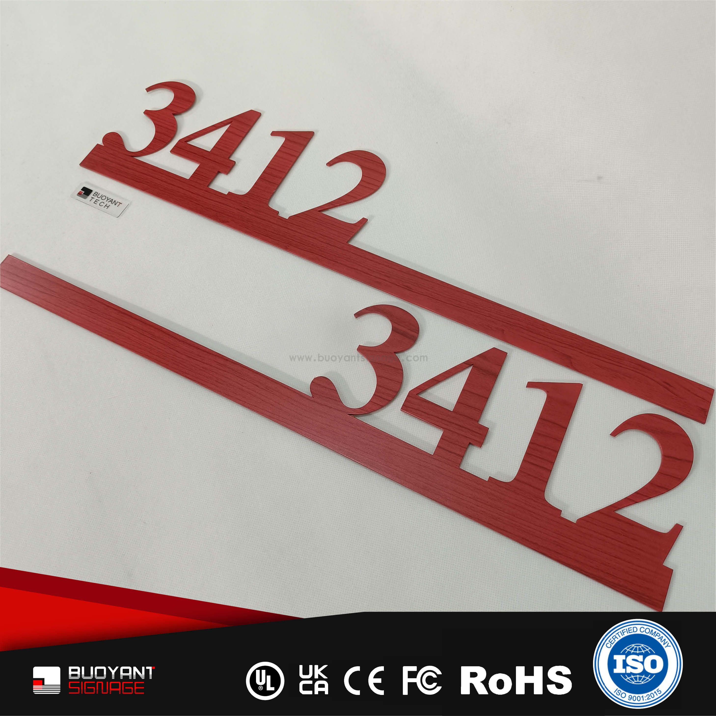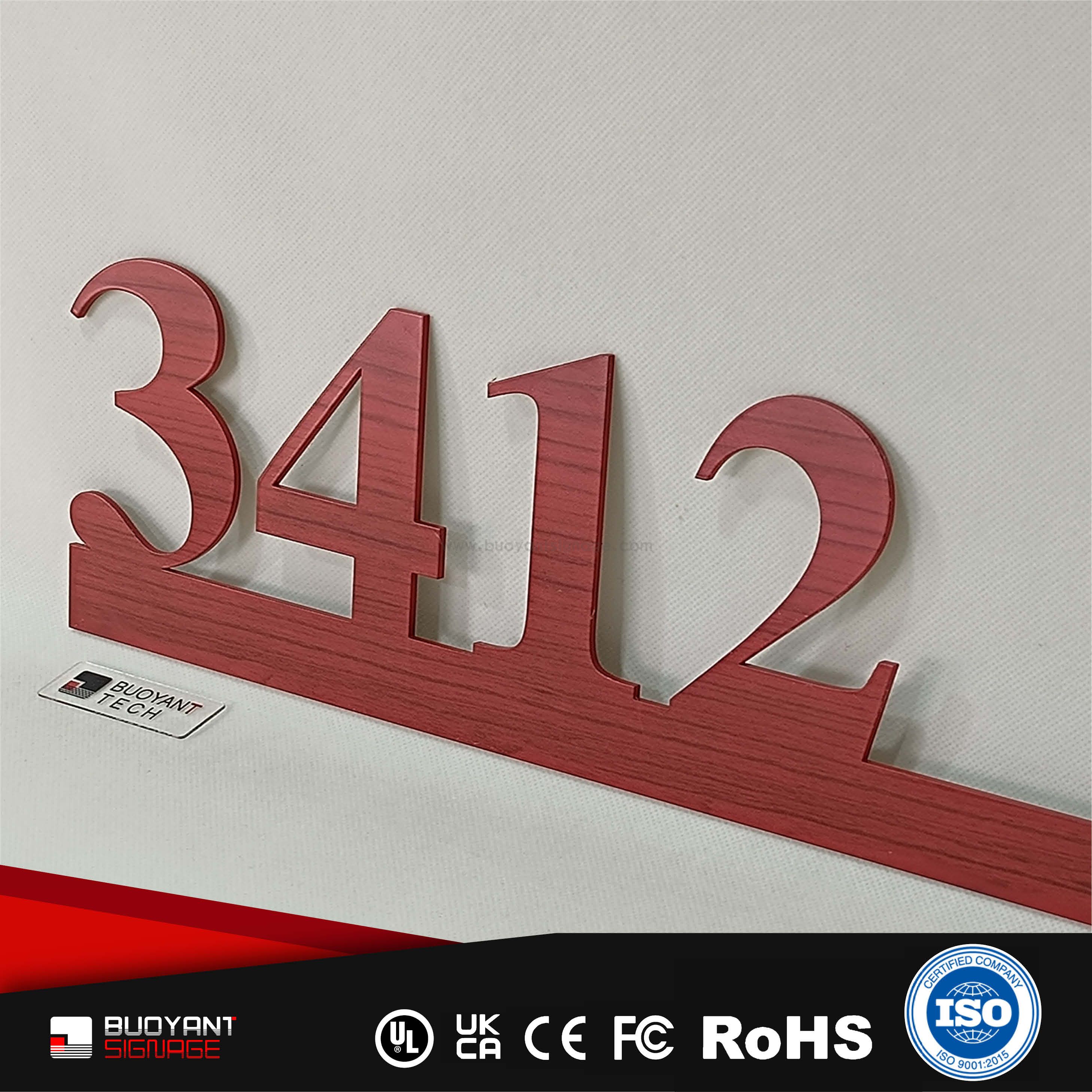 Room number signs are produced using aluminum, acrylic, or stainless steel, supporting bulk and project customization.