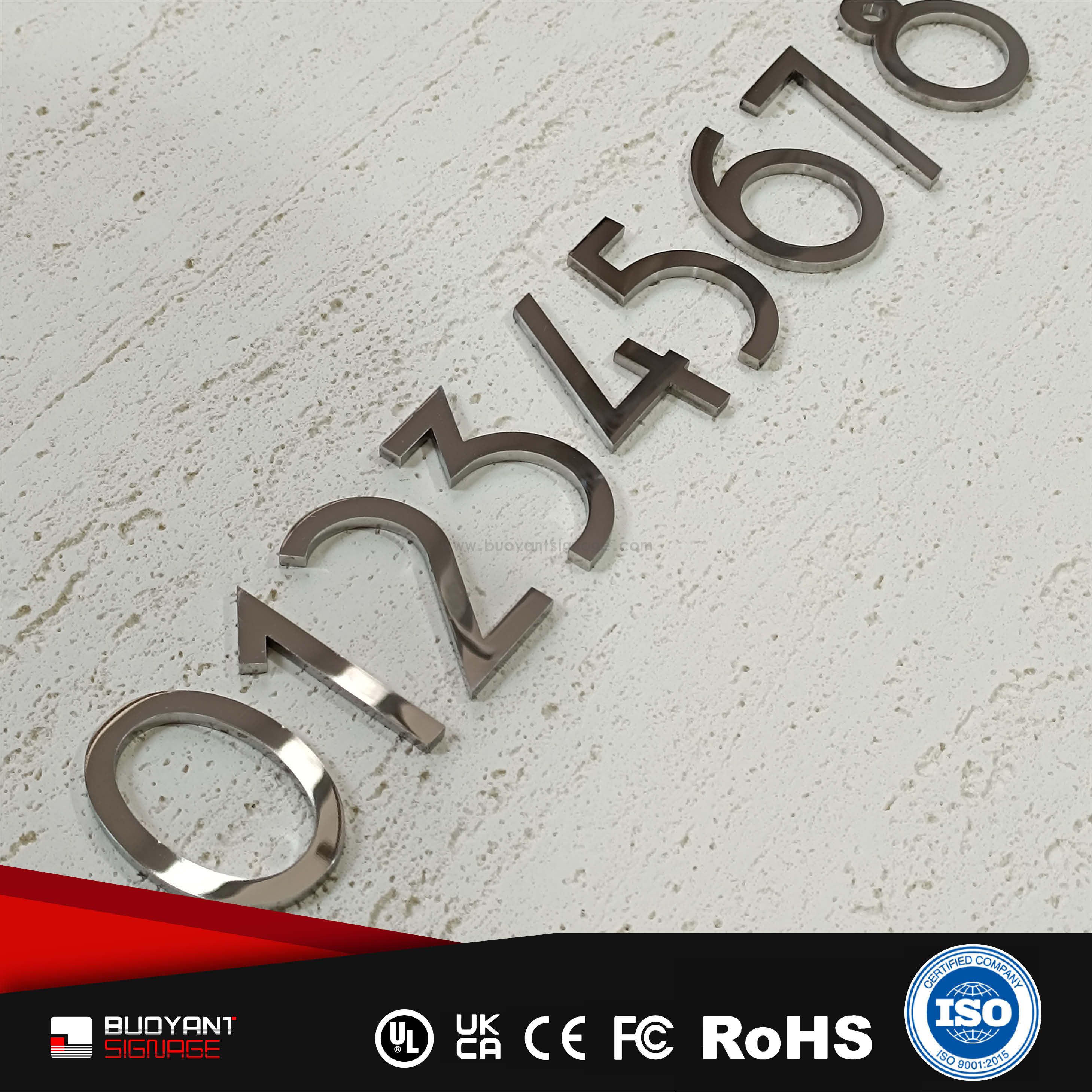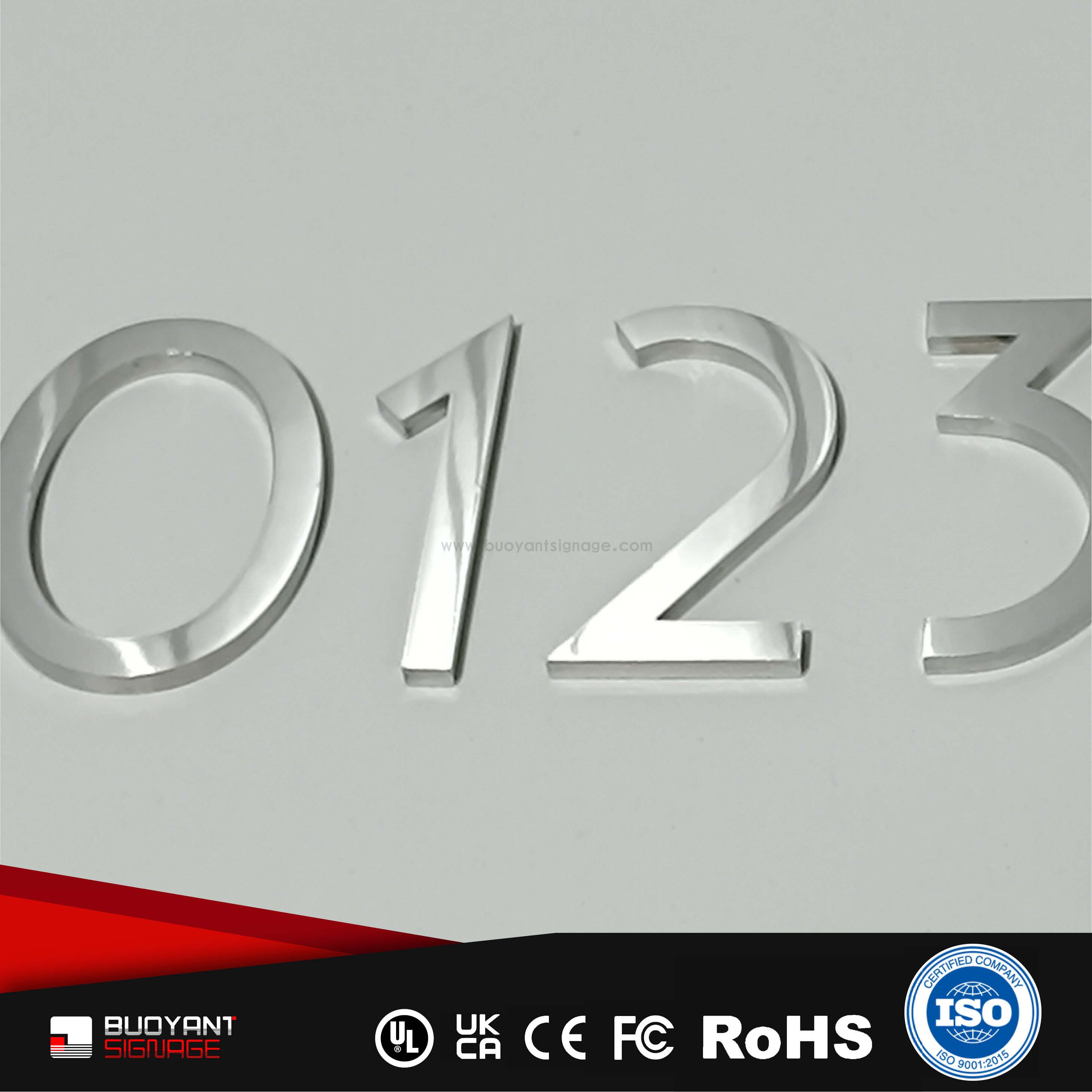 Room number signs are produced using aluminum, acrylic, or stainless steel, supporting bulk and project customization.