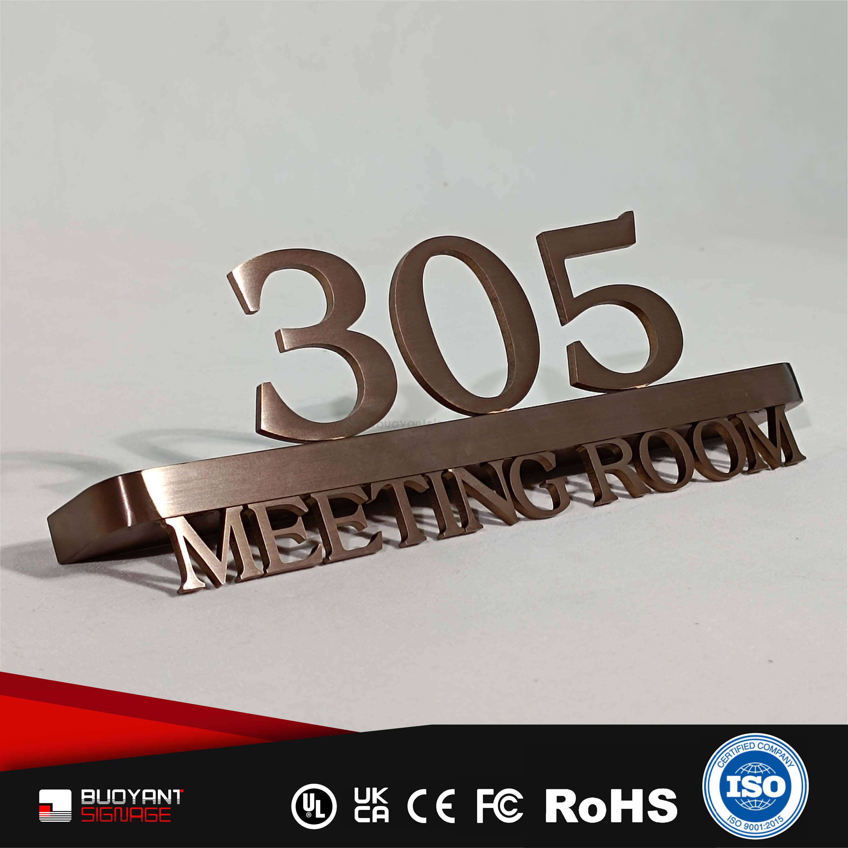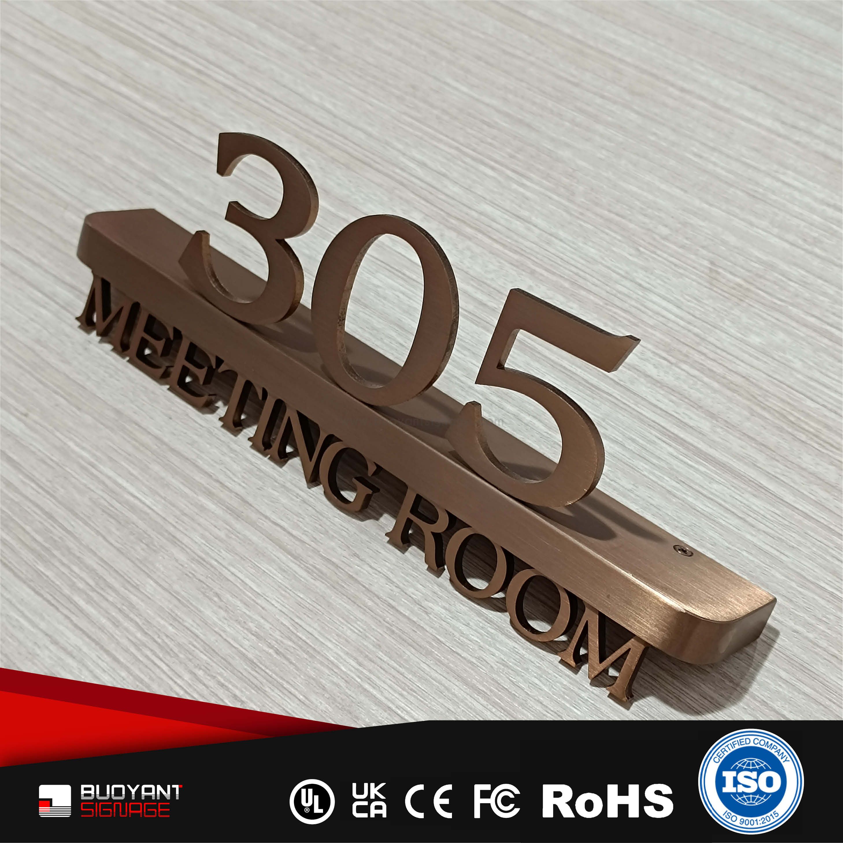 Room number signs are produced using aluminum, acrylic, or stainless steel, supporting bulk and project customization.