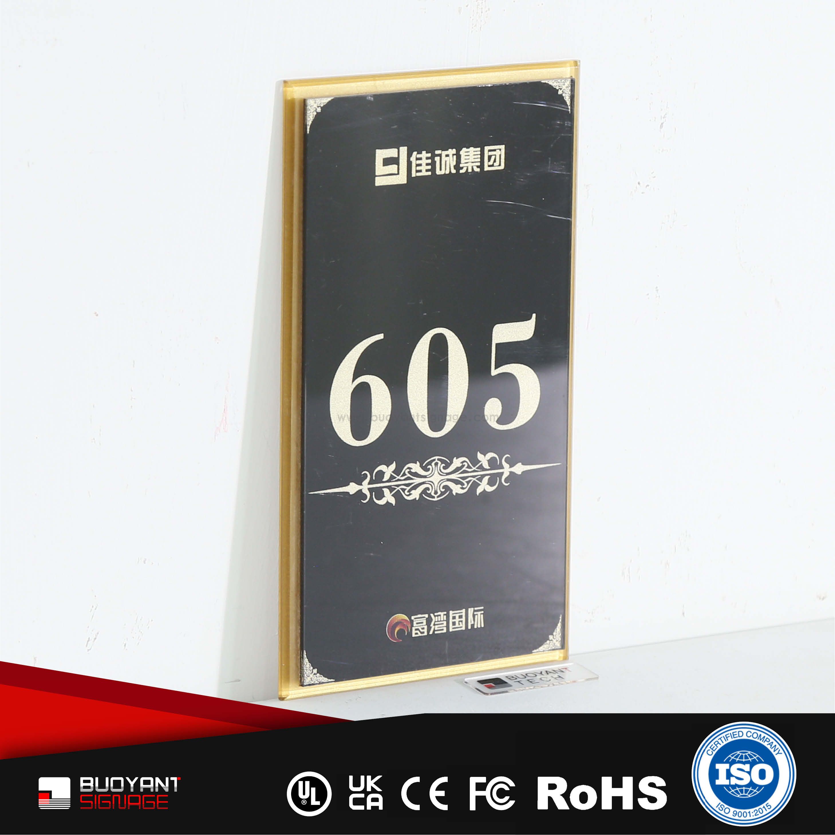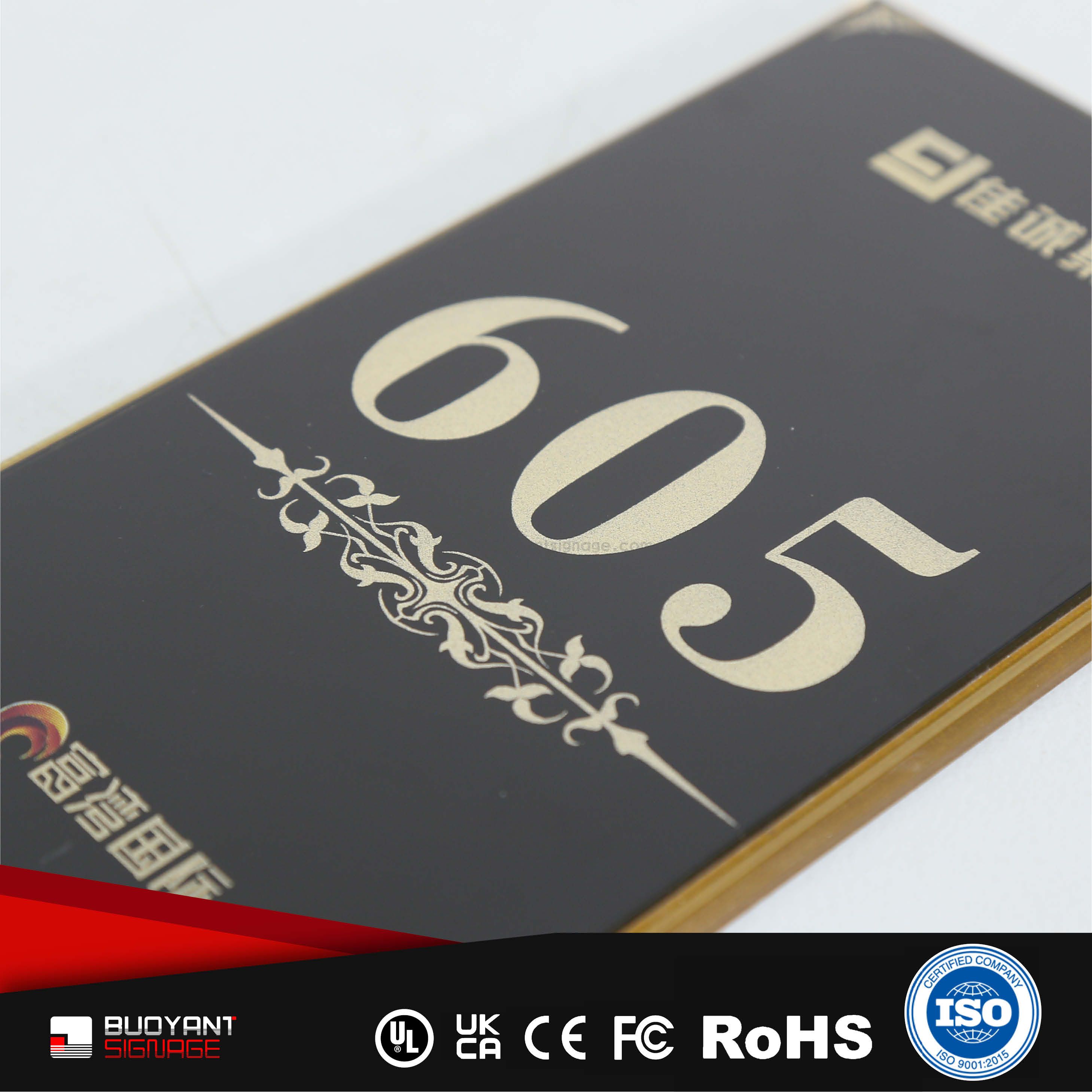 Room number signs are produced using aluminum, acrylic, or stainless steel, supporting bulk and project customization.