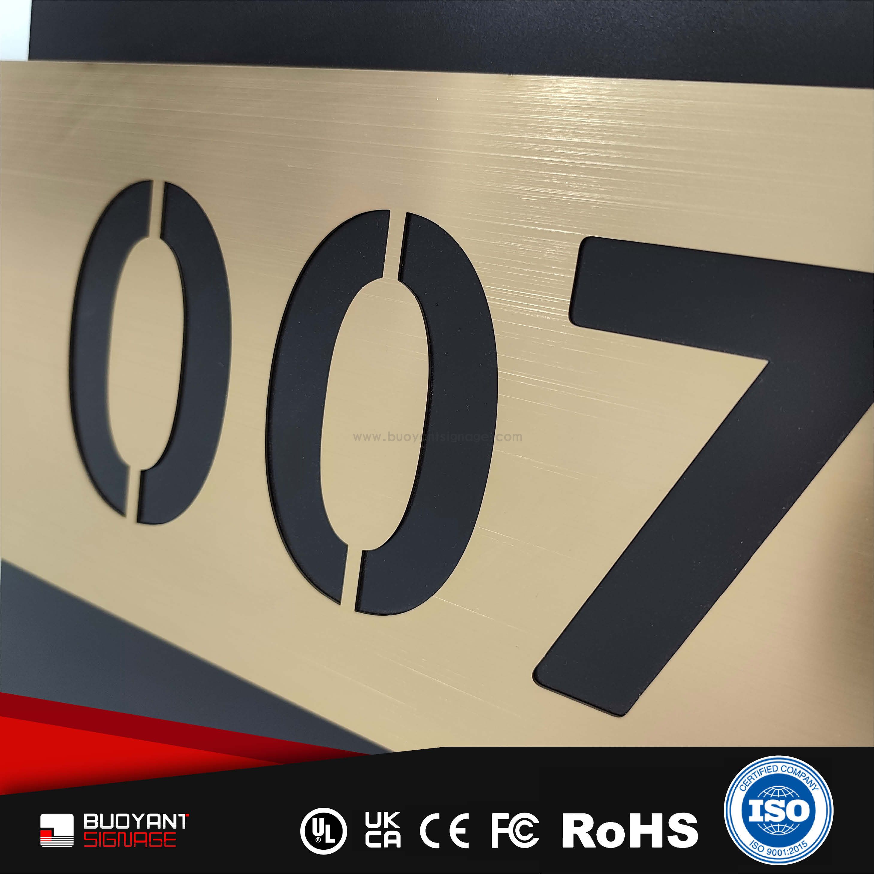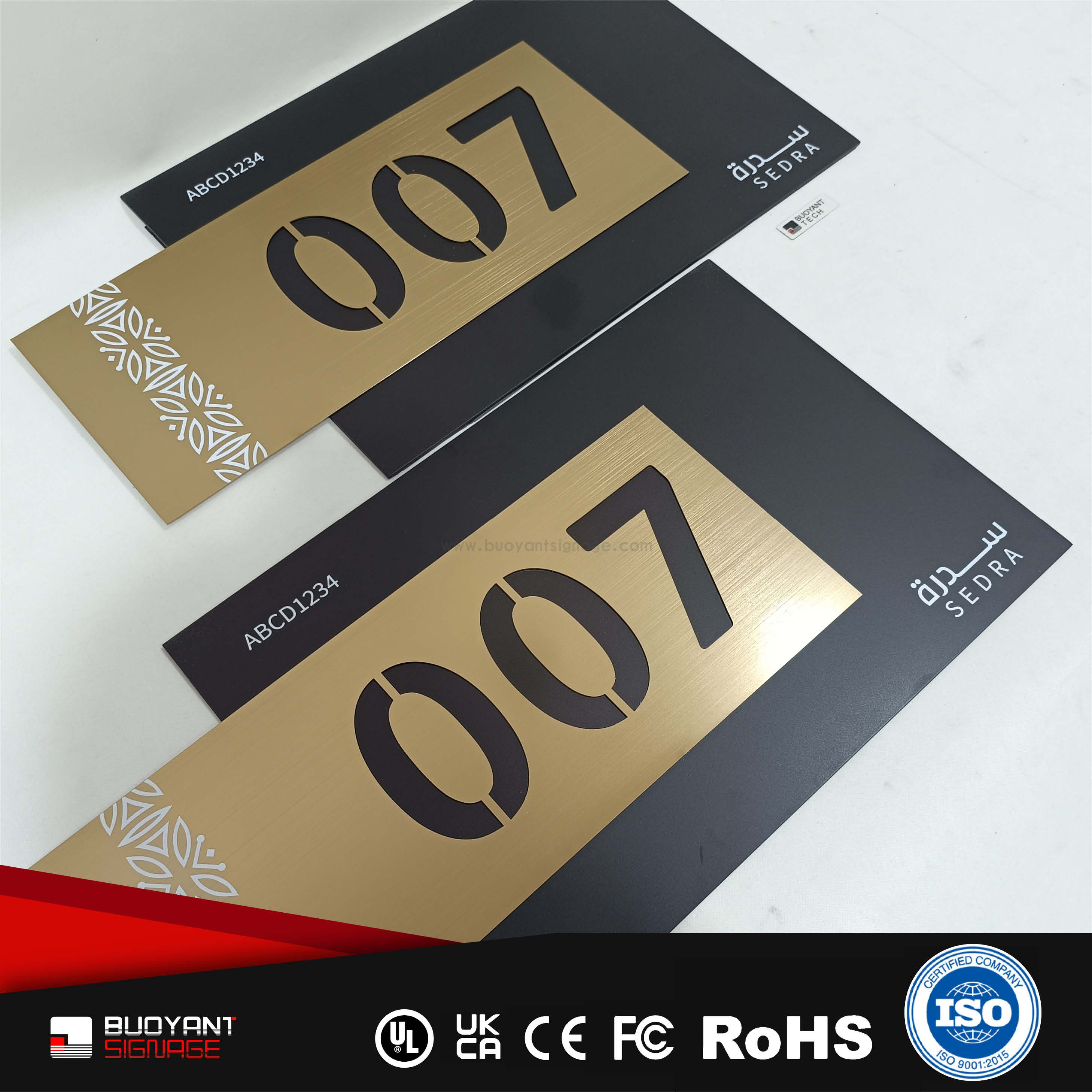 Room number signs are produced using aluminum, acrylic, or stainless steel, supporting bulk and project customization.