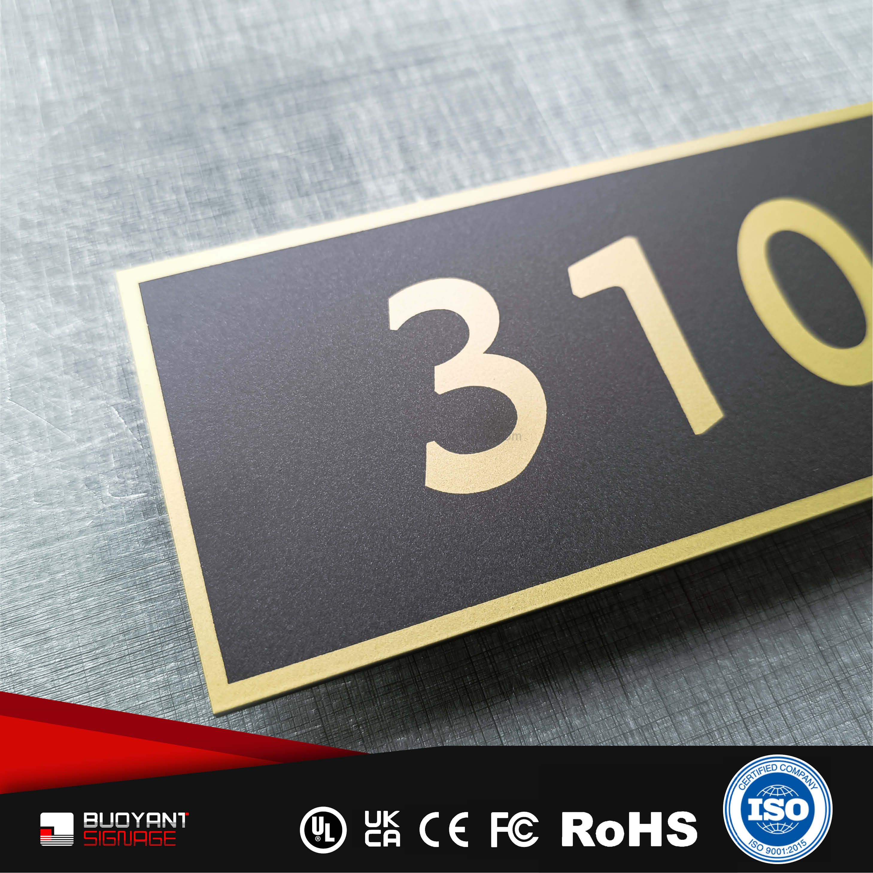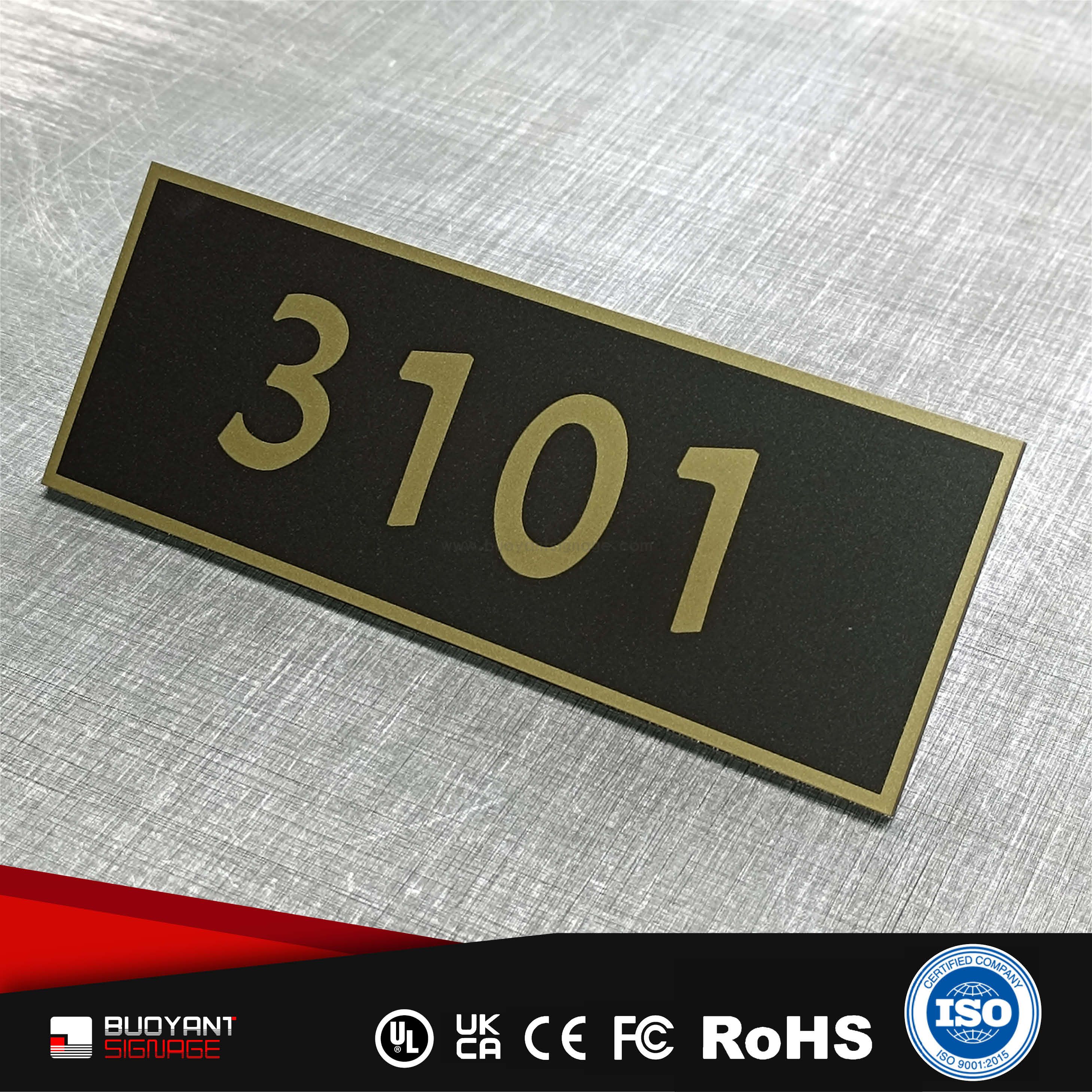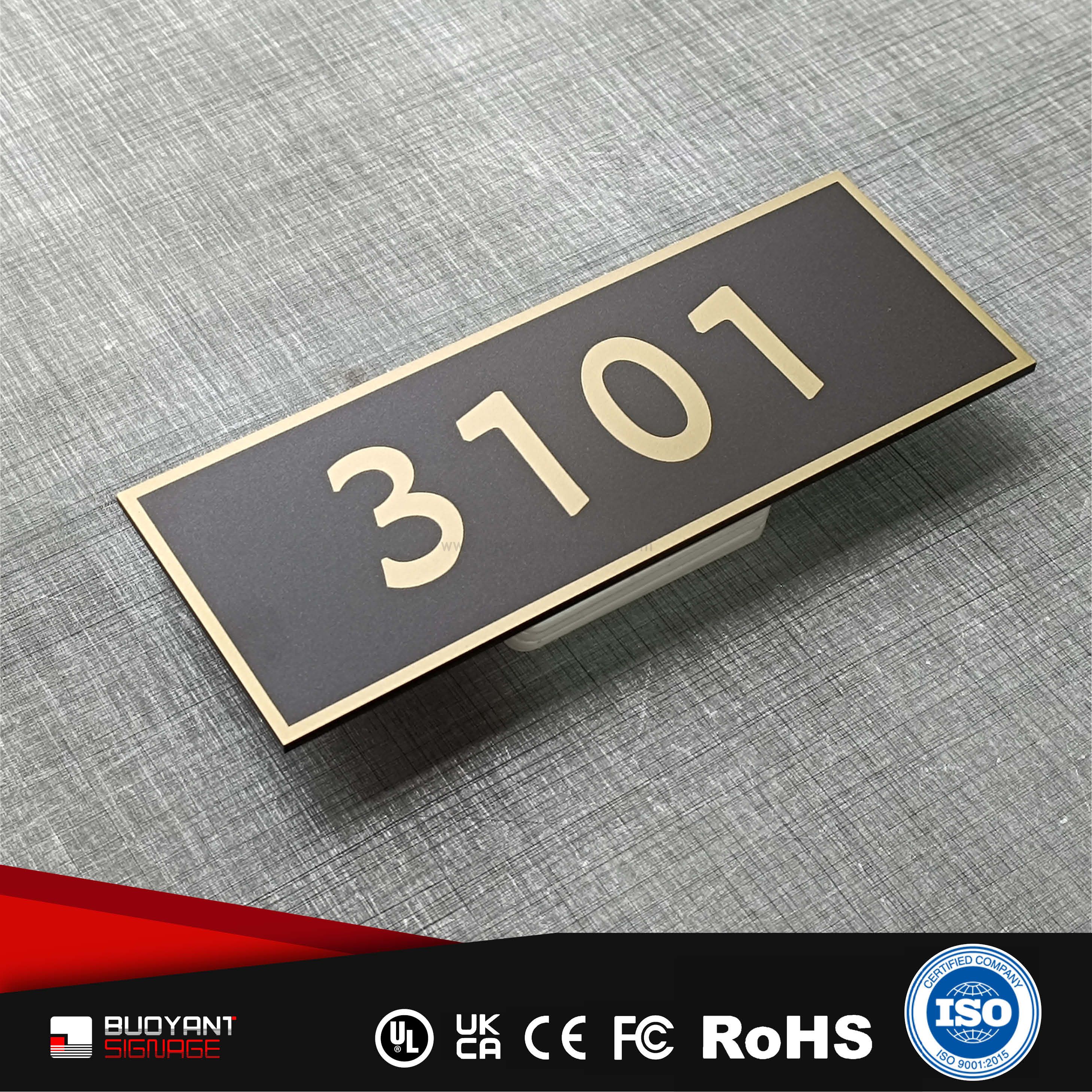Room number signs are produced using aluminum, acrylic, or stainless steel, supporting bulk and project customization.