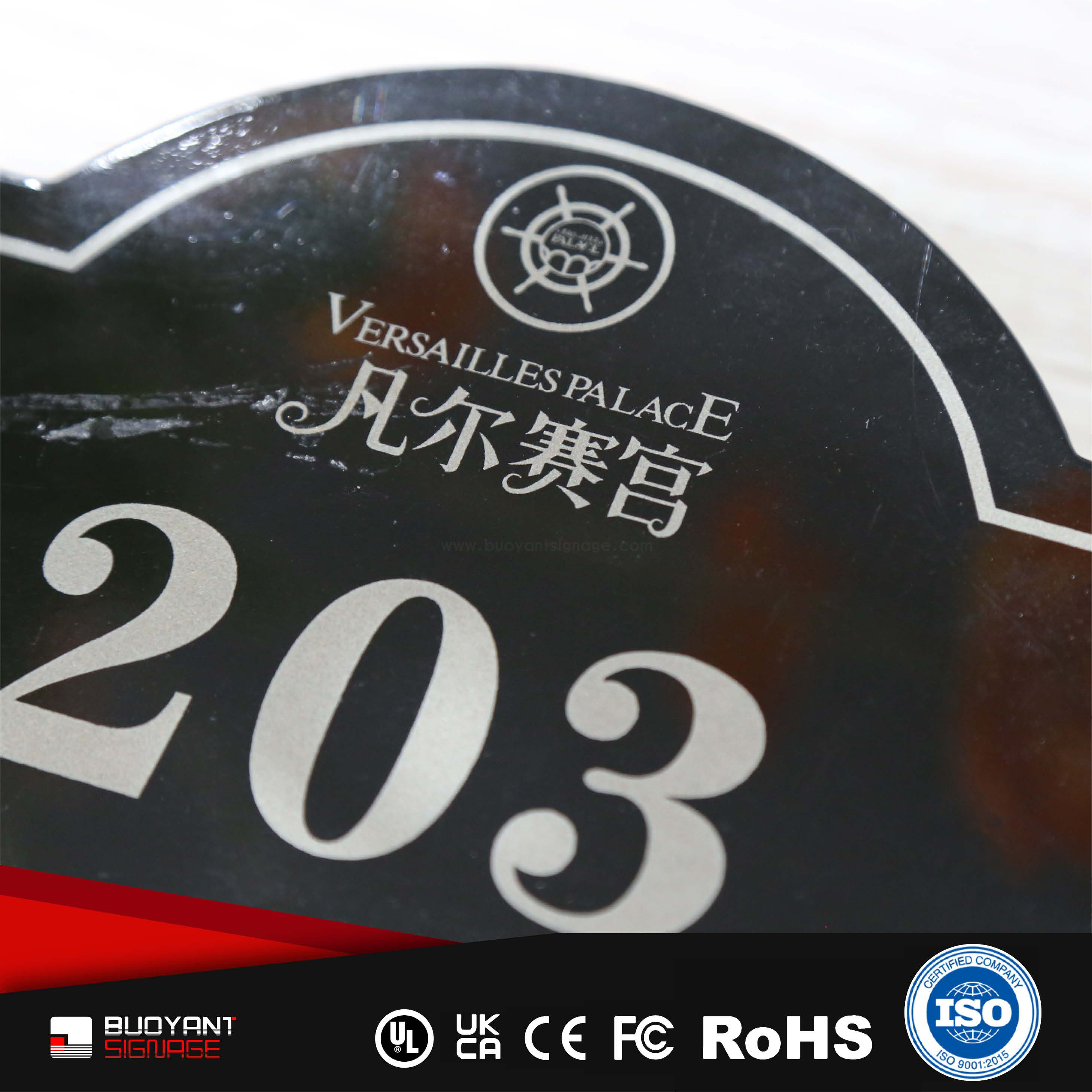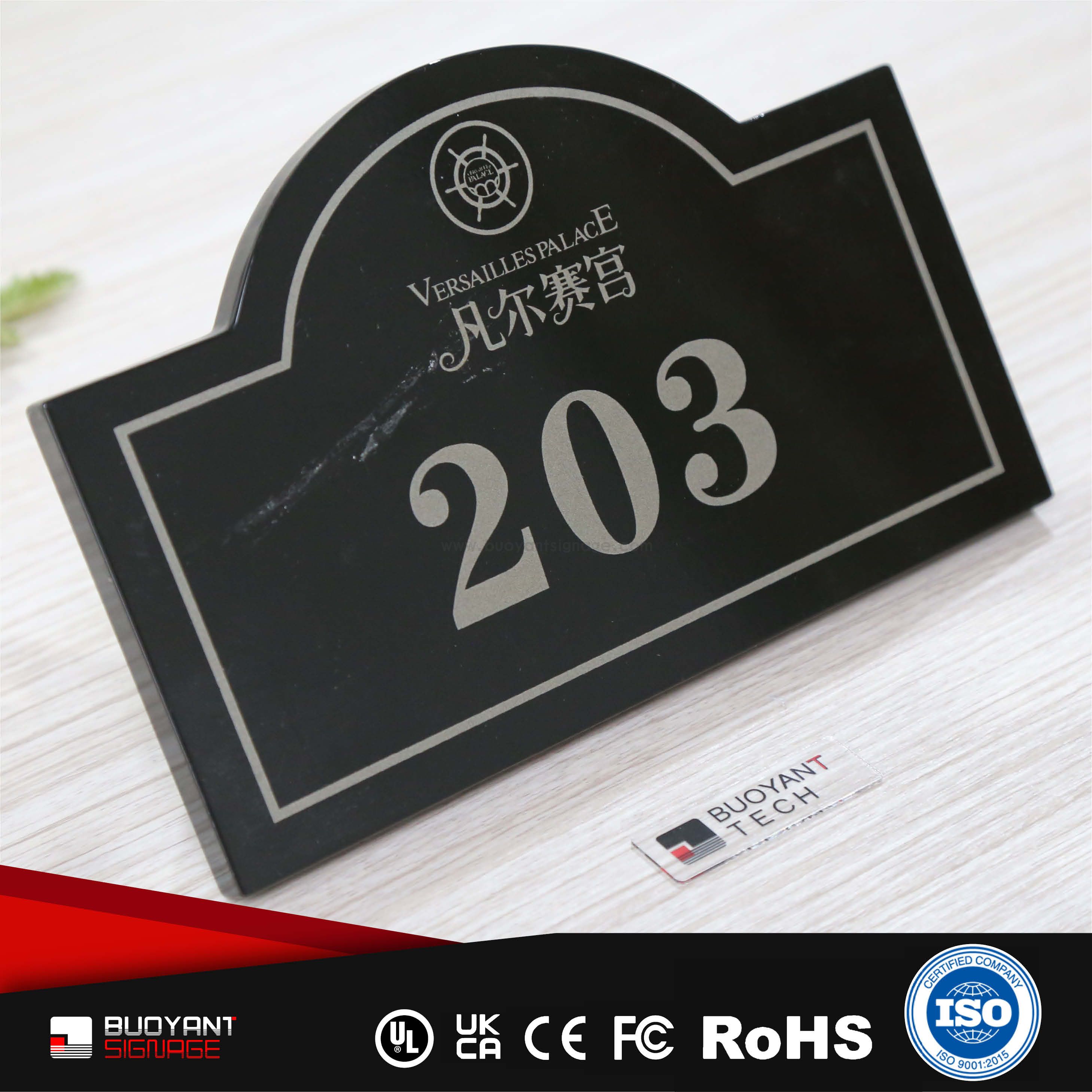 Room number signs are produced using aluminum, acrylic, or stainless steel, supporting bulk and project customization.