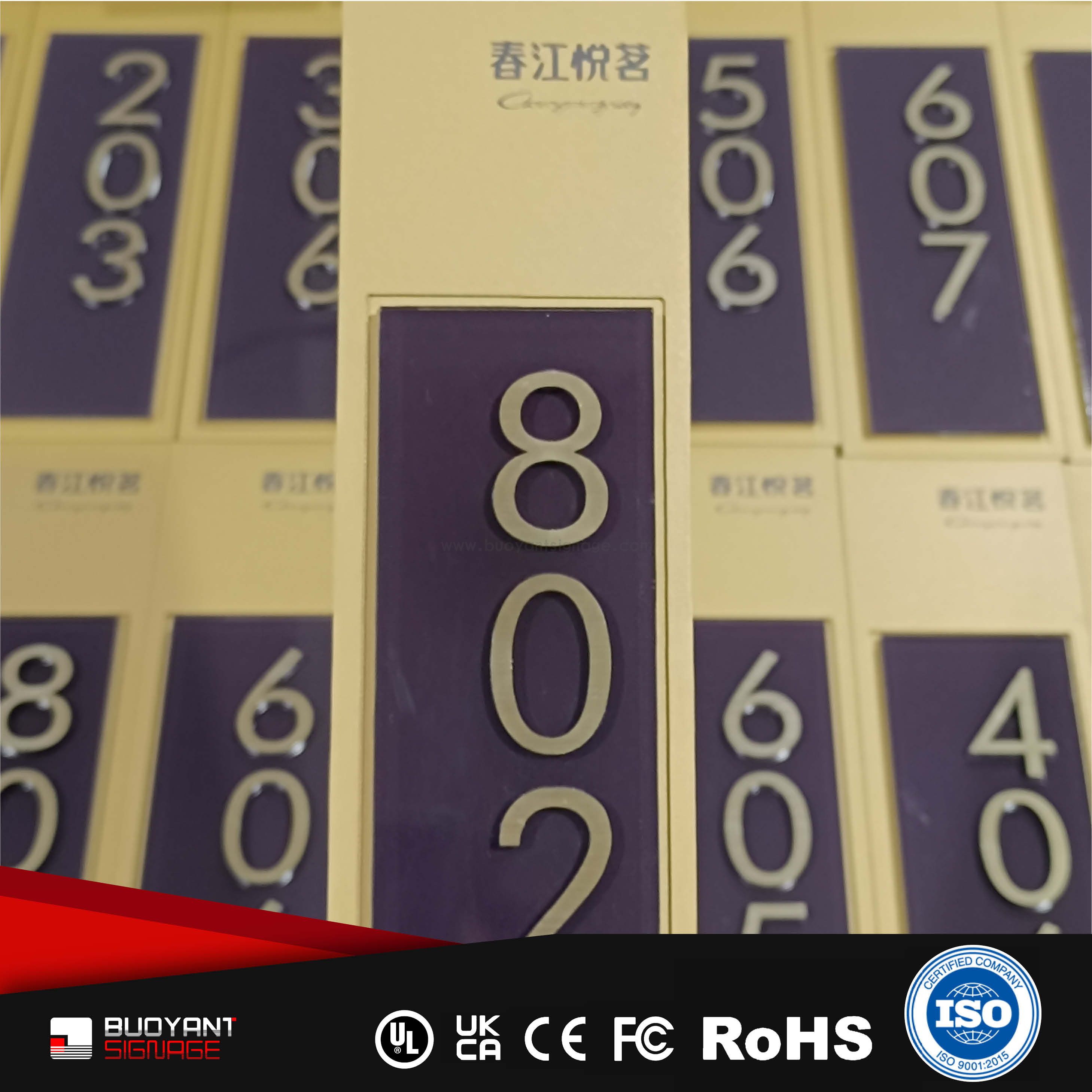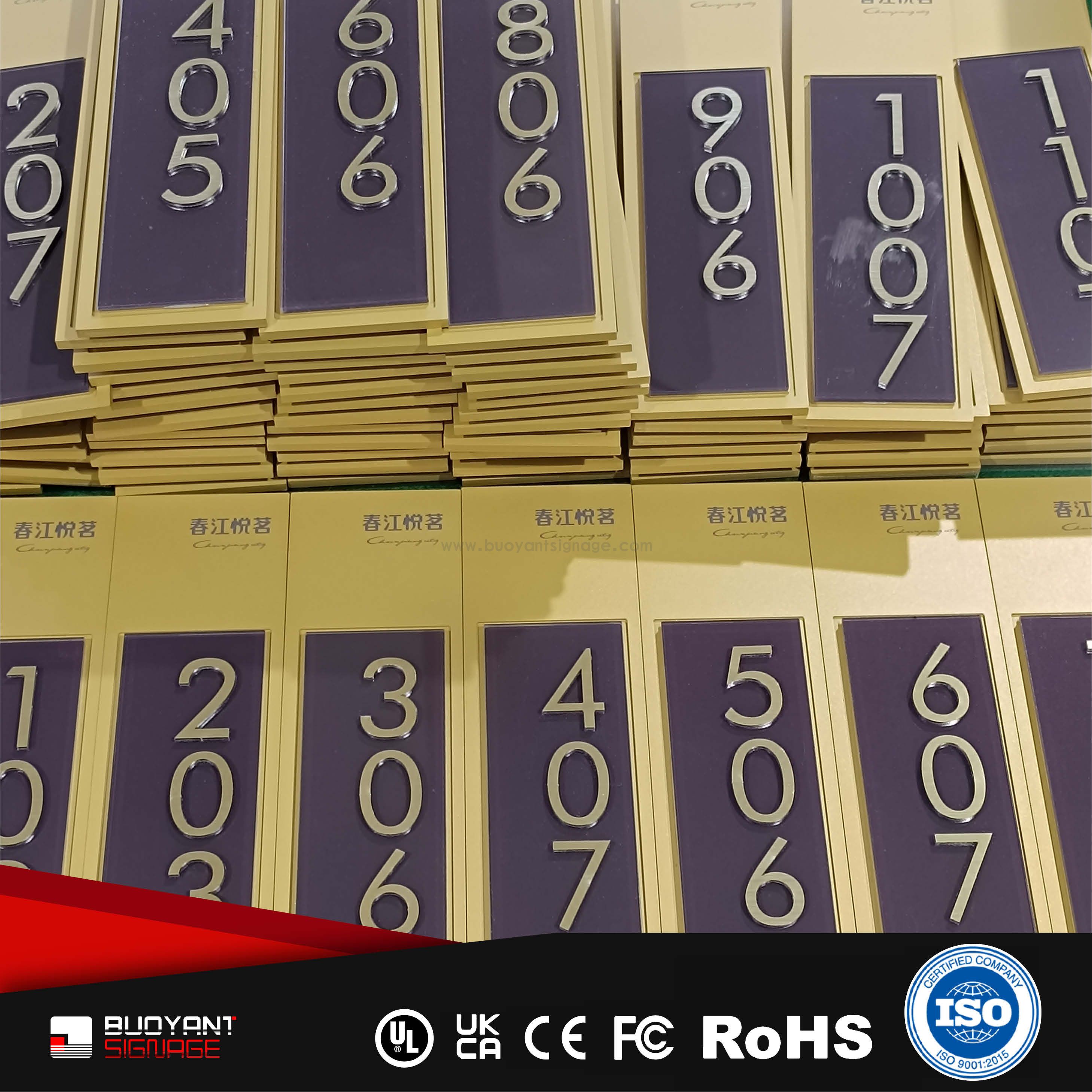 Room number signs are produced using aluminum, acrylic, or stainless steel, supporting bulk and project customization.
