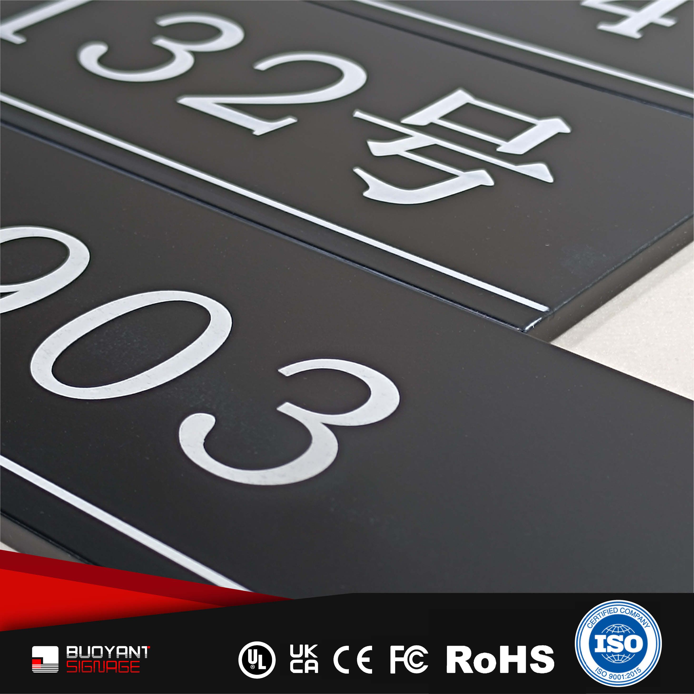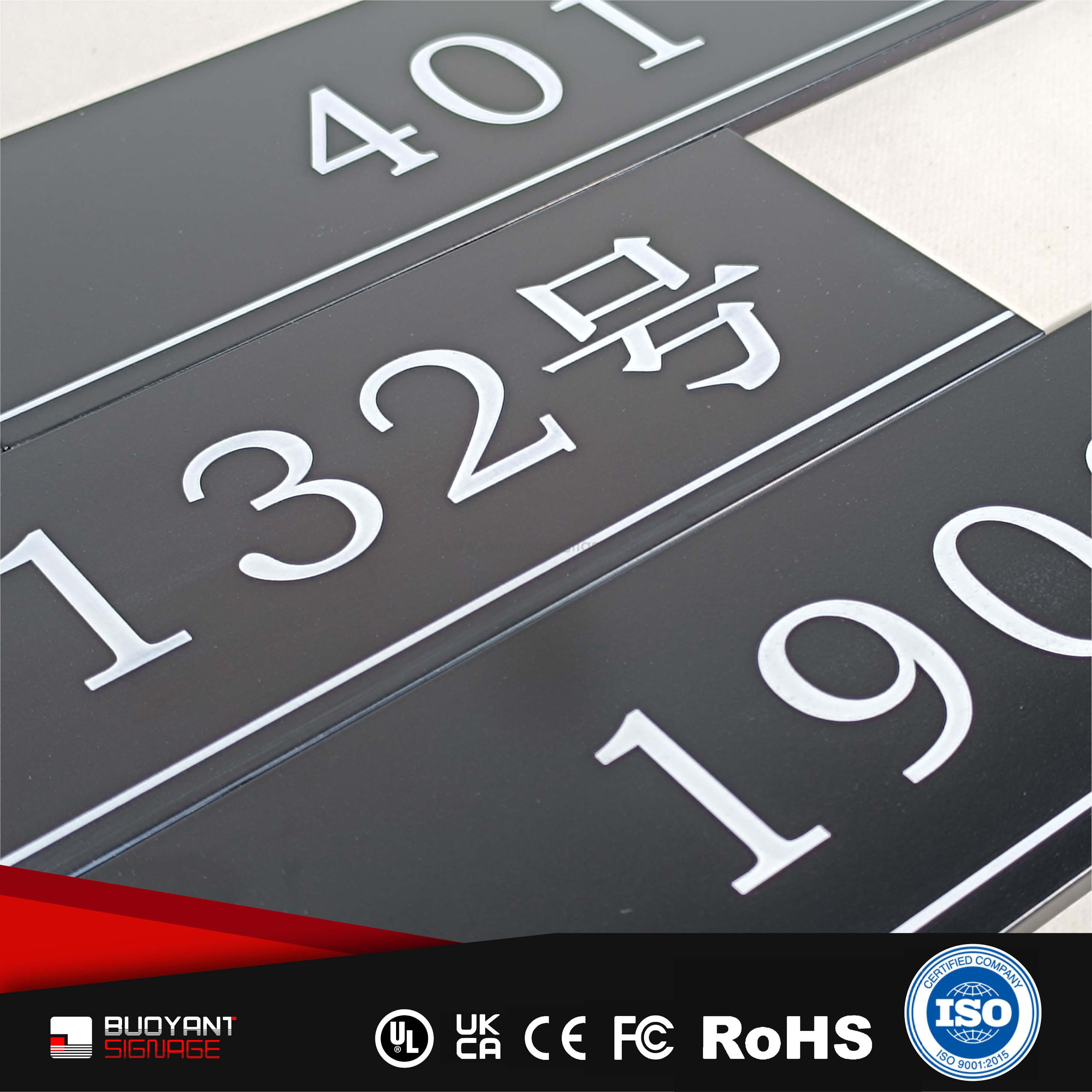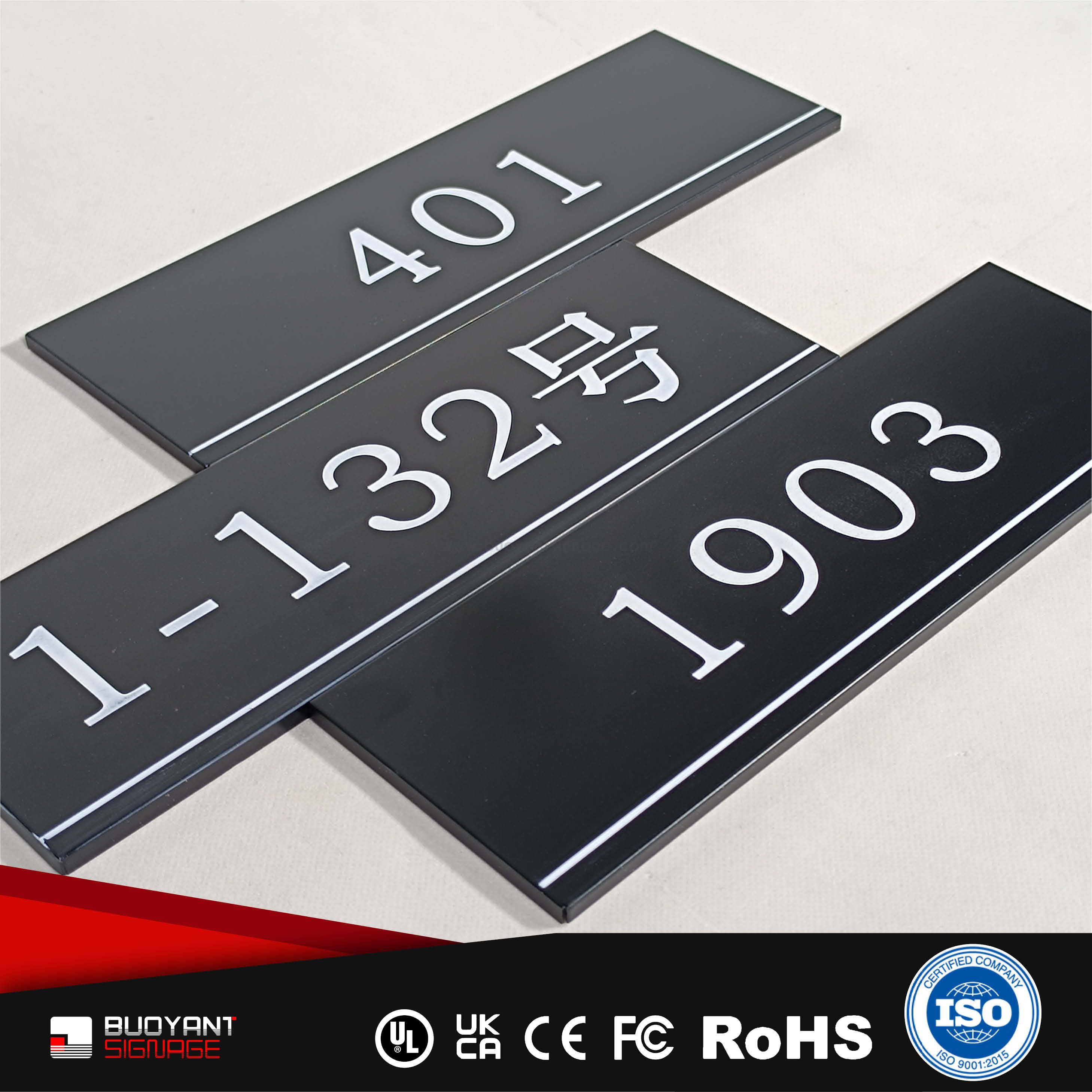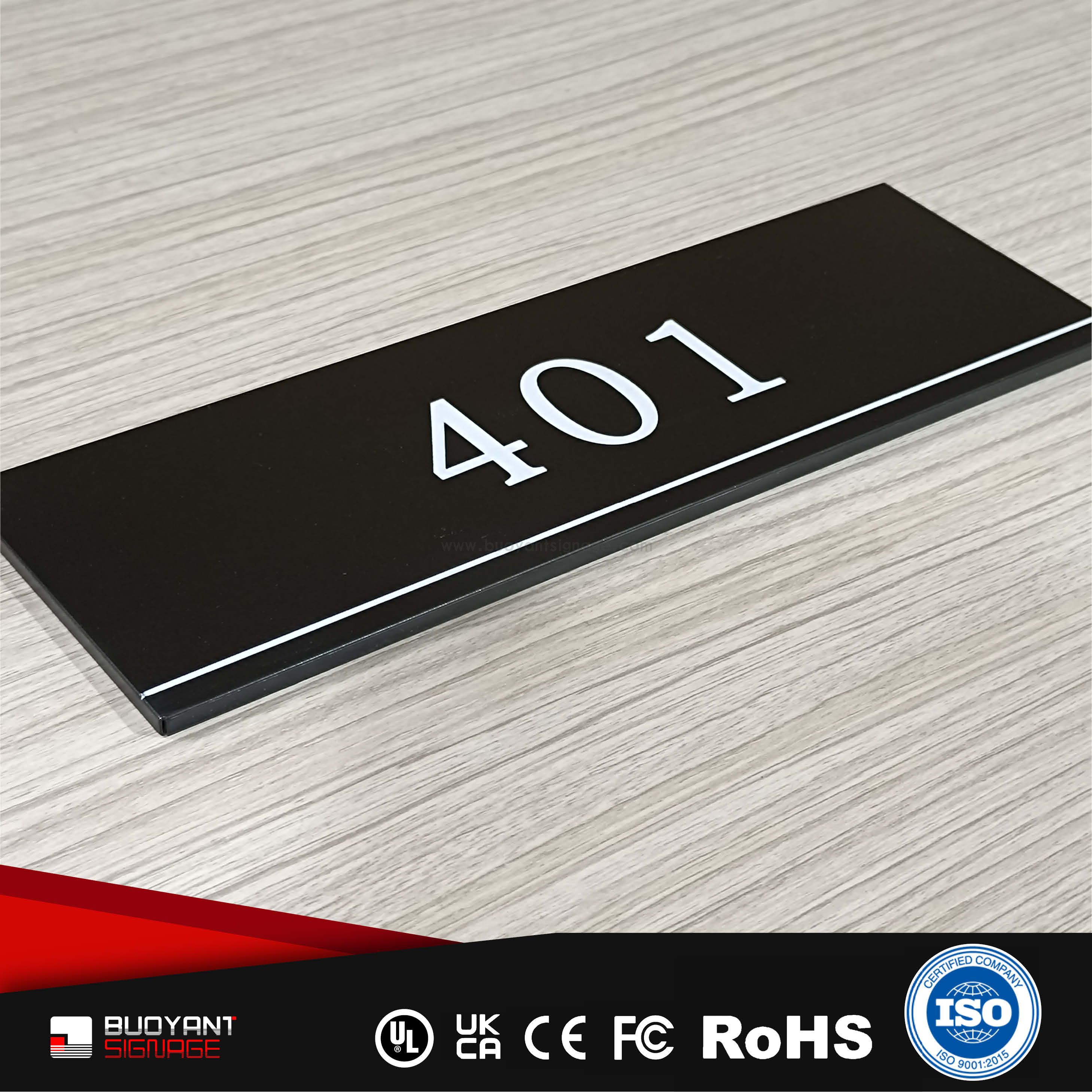Room number signs are produced using aluminum, acrylic, or stainless steel, supporting bulk and project customization.