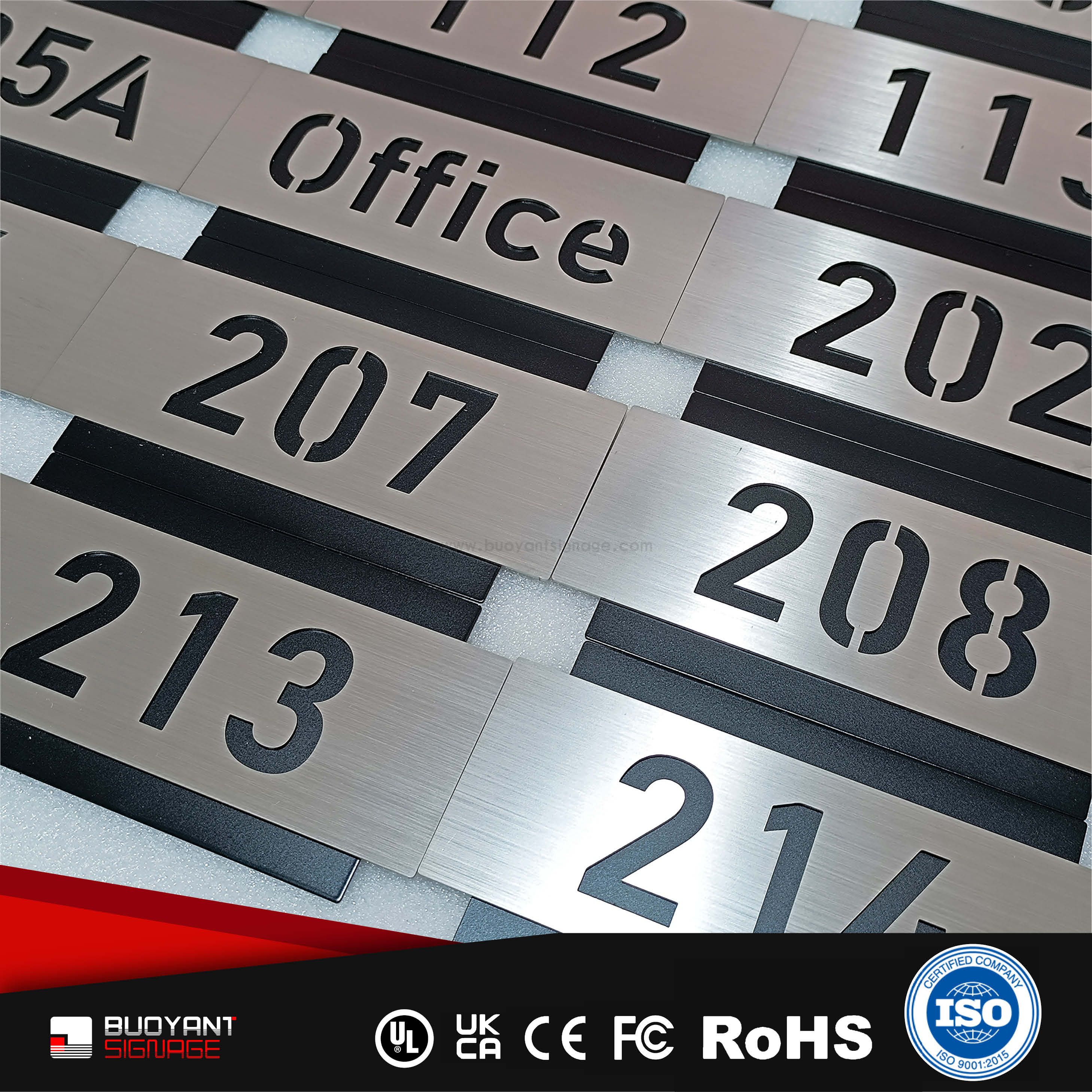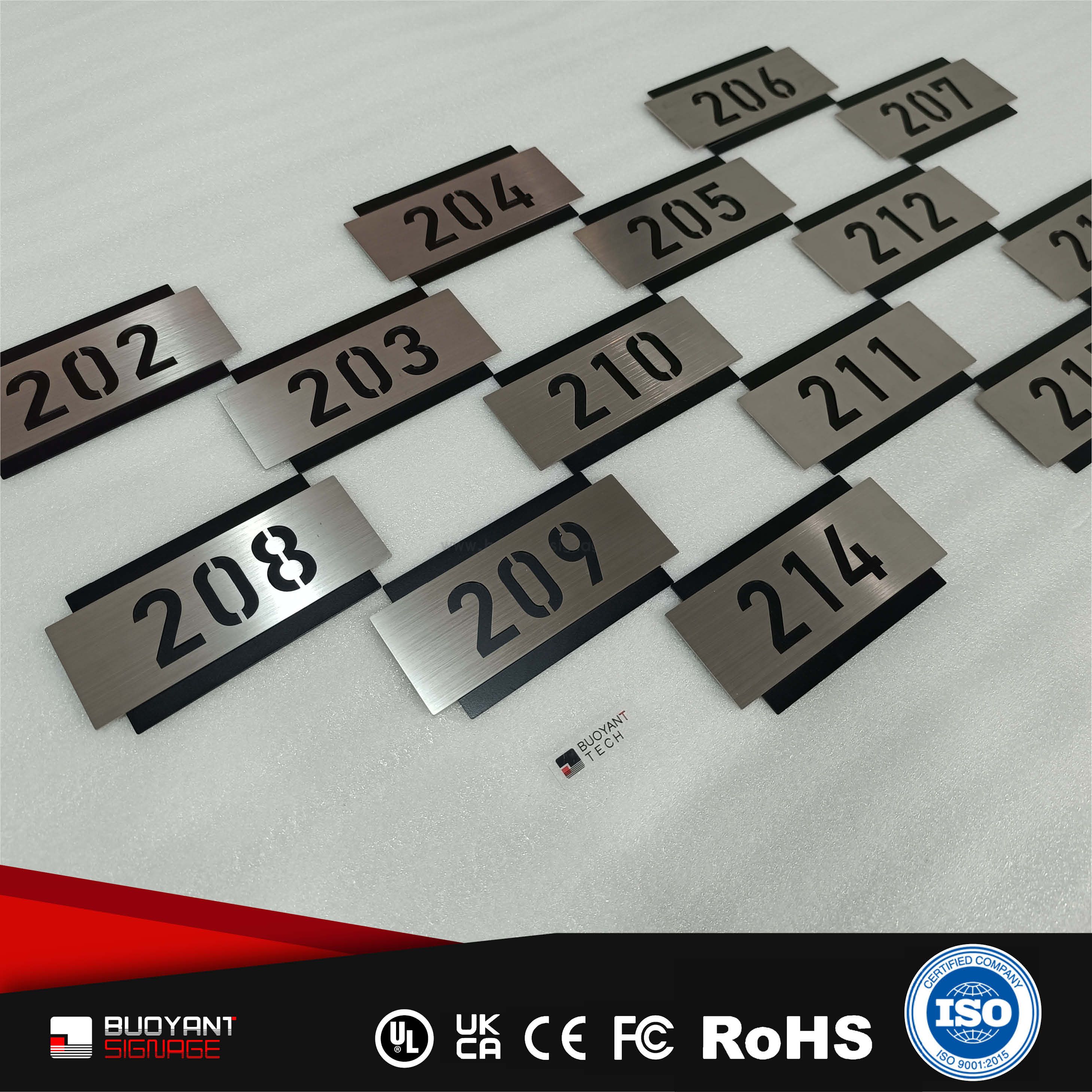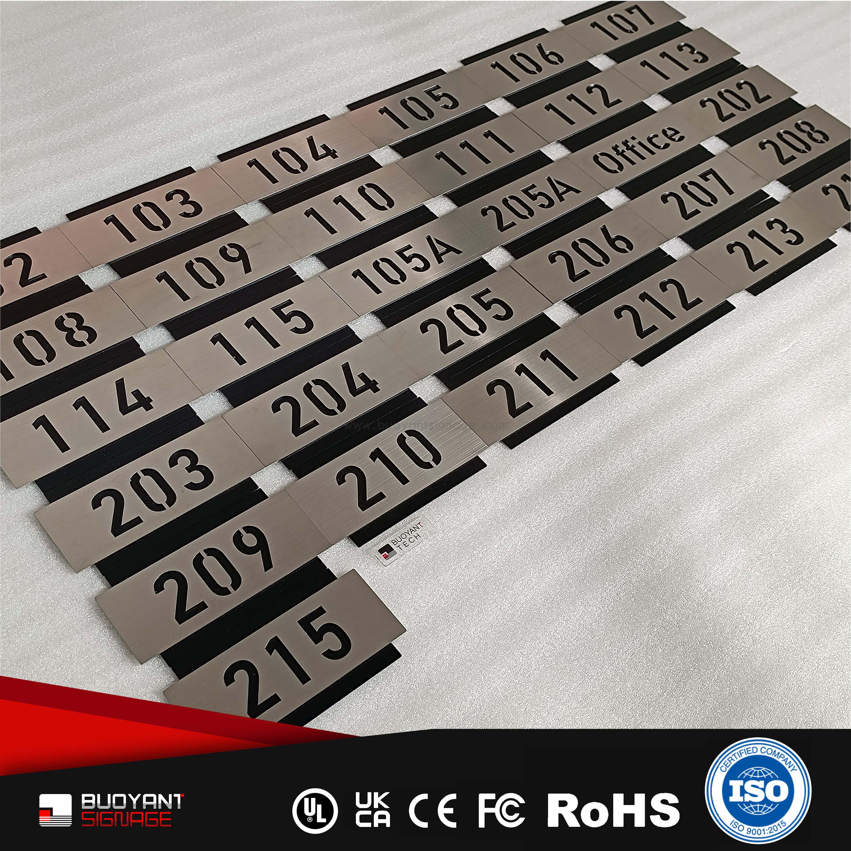 Room number signs are produced using aluminum, acrylic, or stainless steel, supporting bulk and project customization.