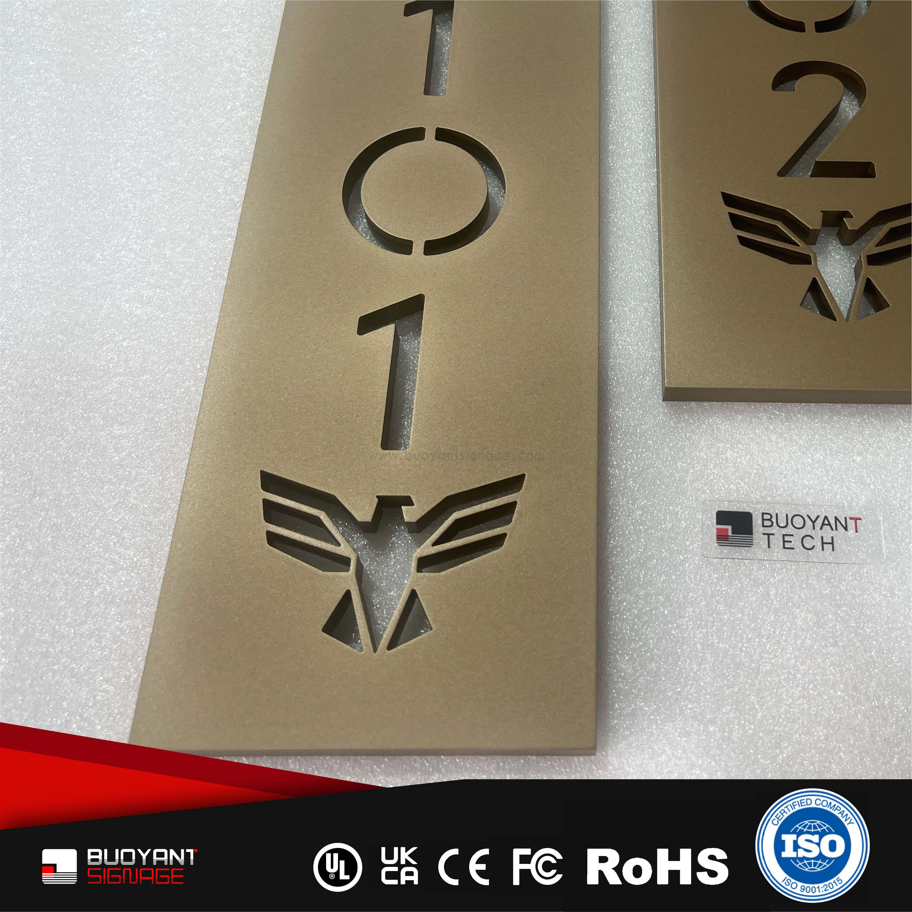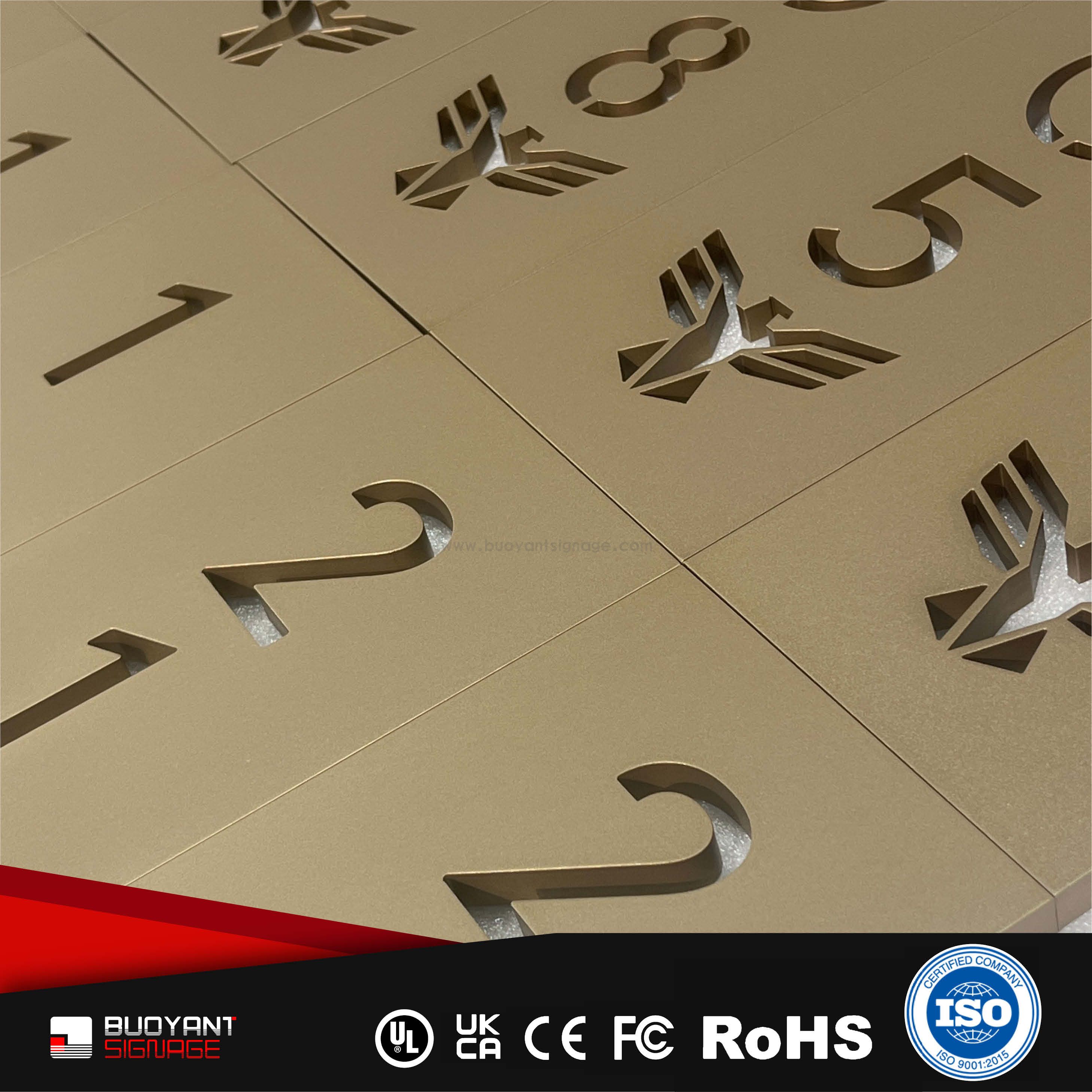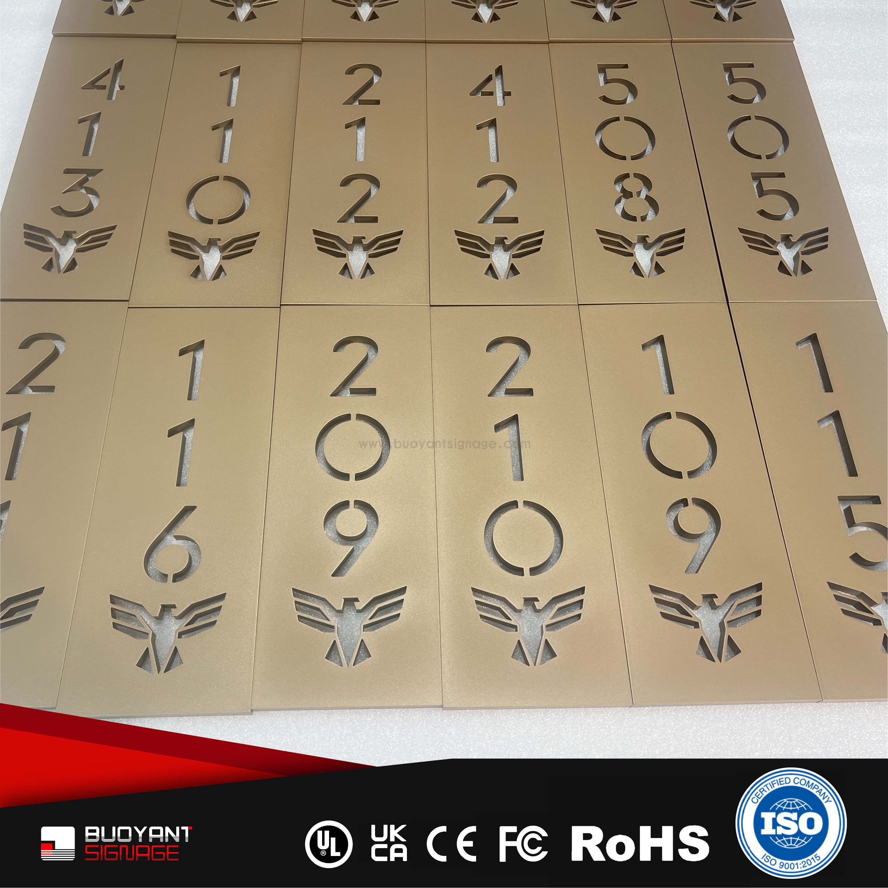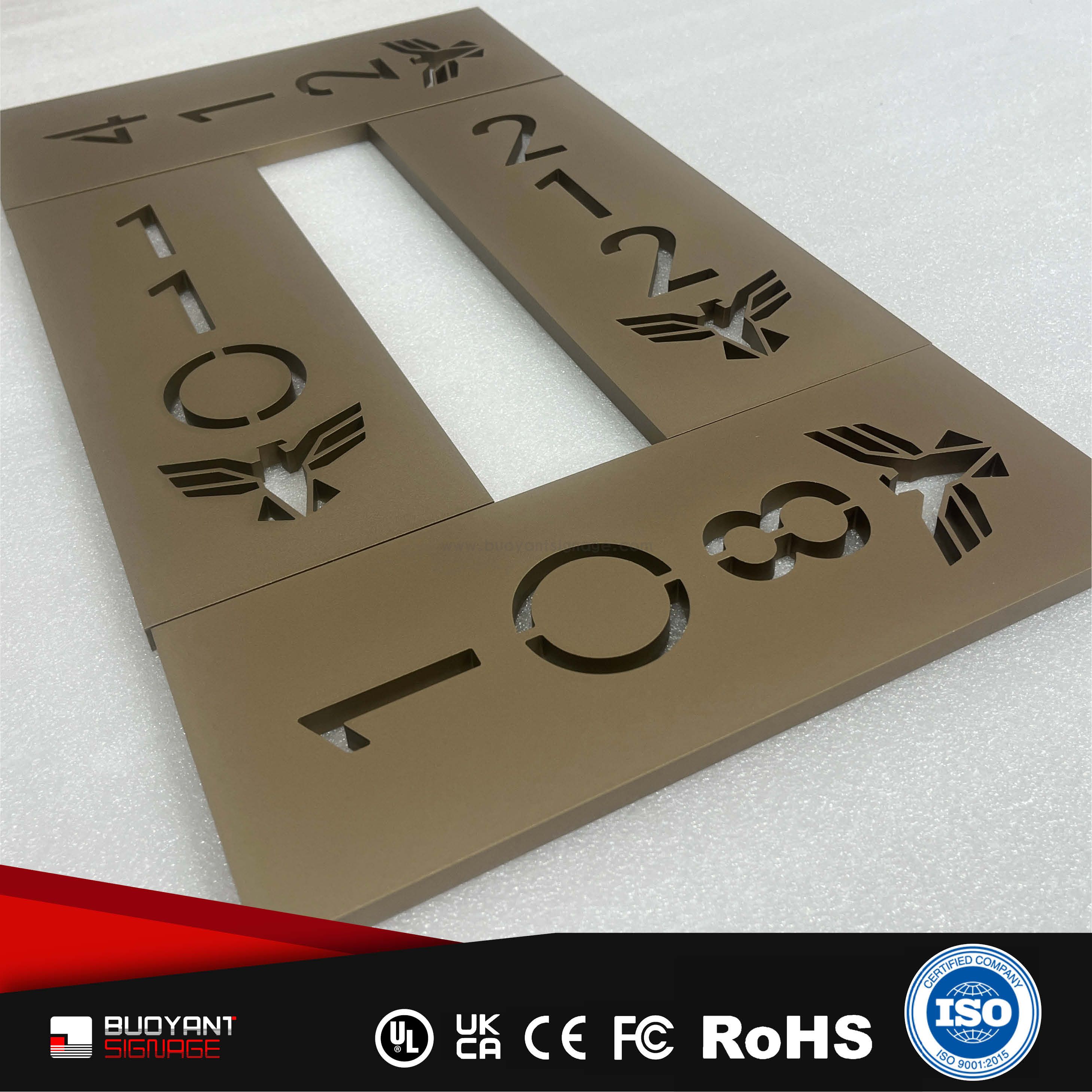Room number signs are produced using aluminum, acrylic, or stainless steel, supporting bulk and project customization.