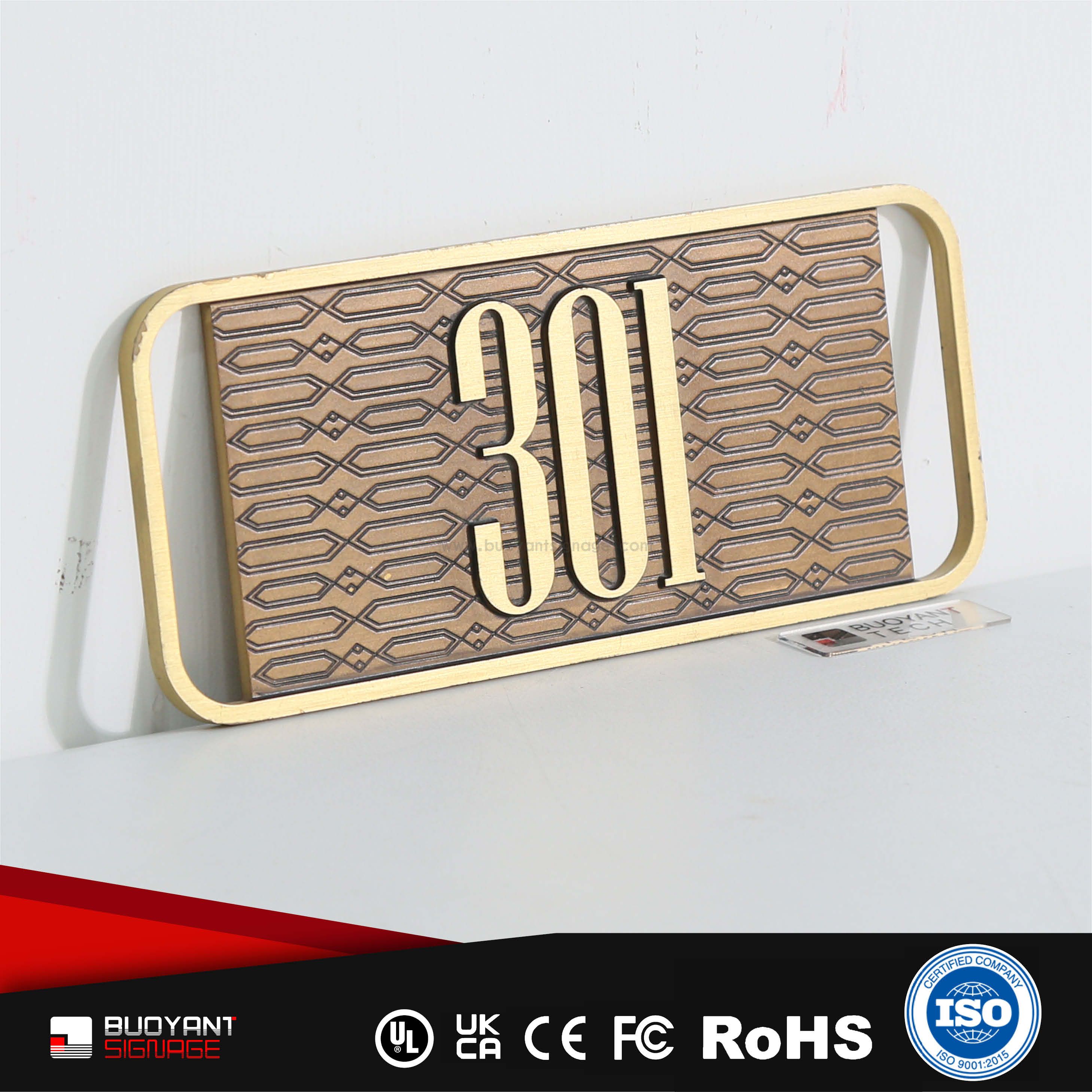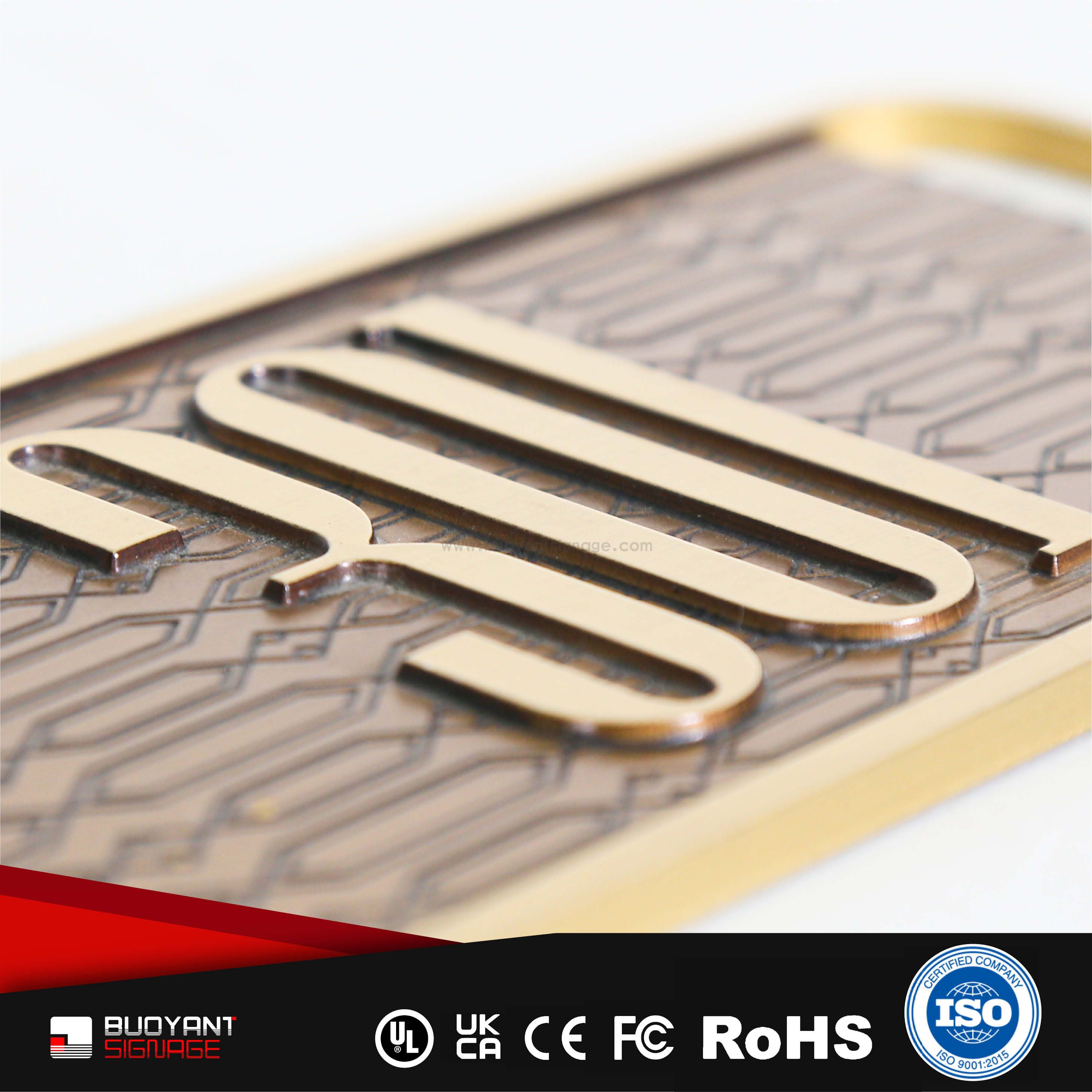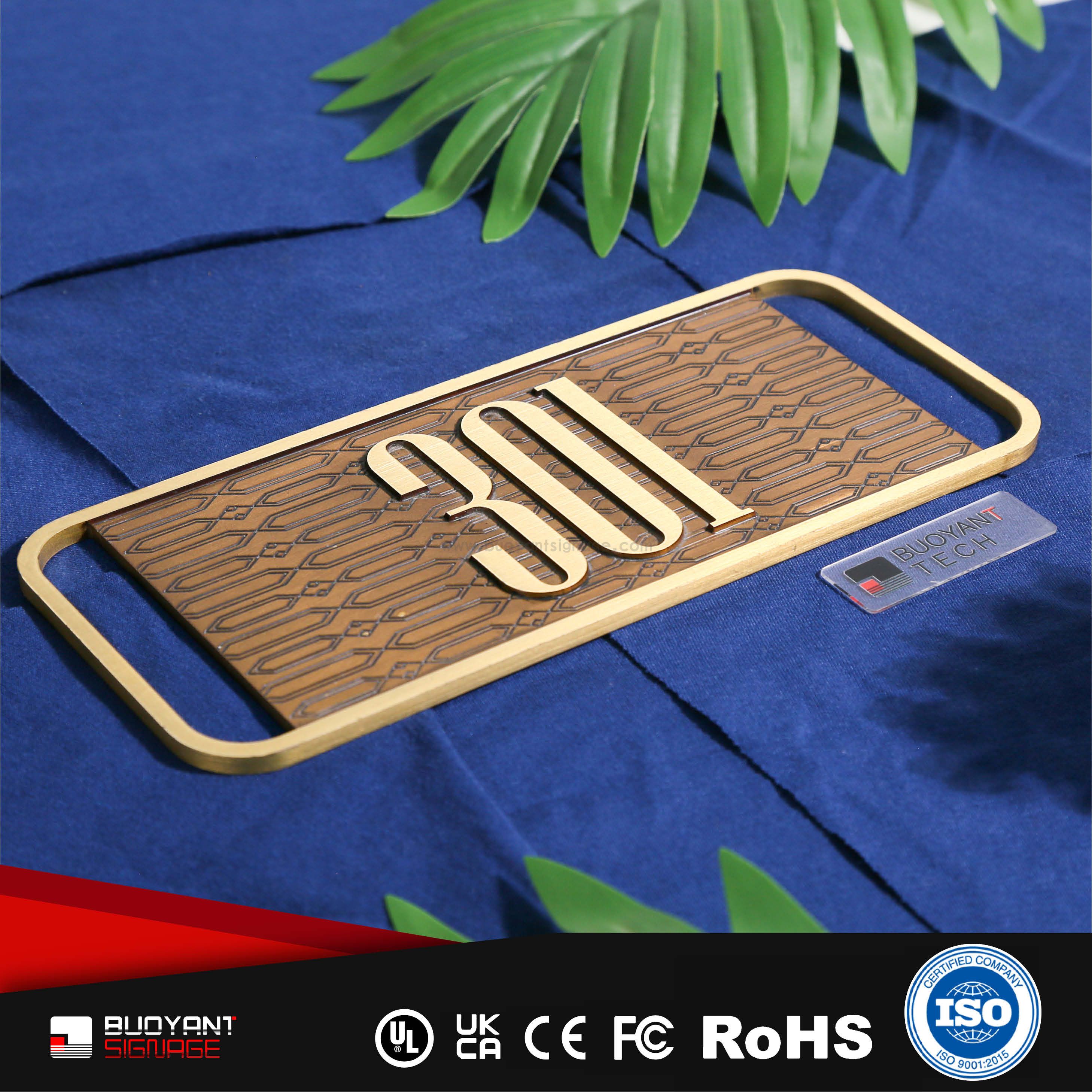 Room number signs are produced using aluminum, acrylic, or stainless steel, supporting bulk and project customization.