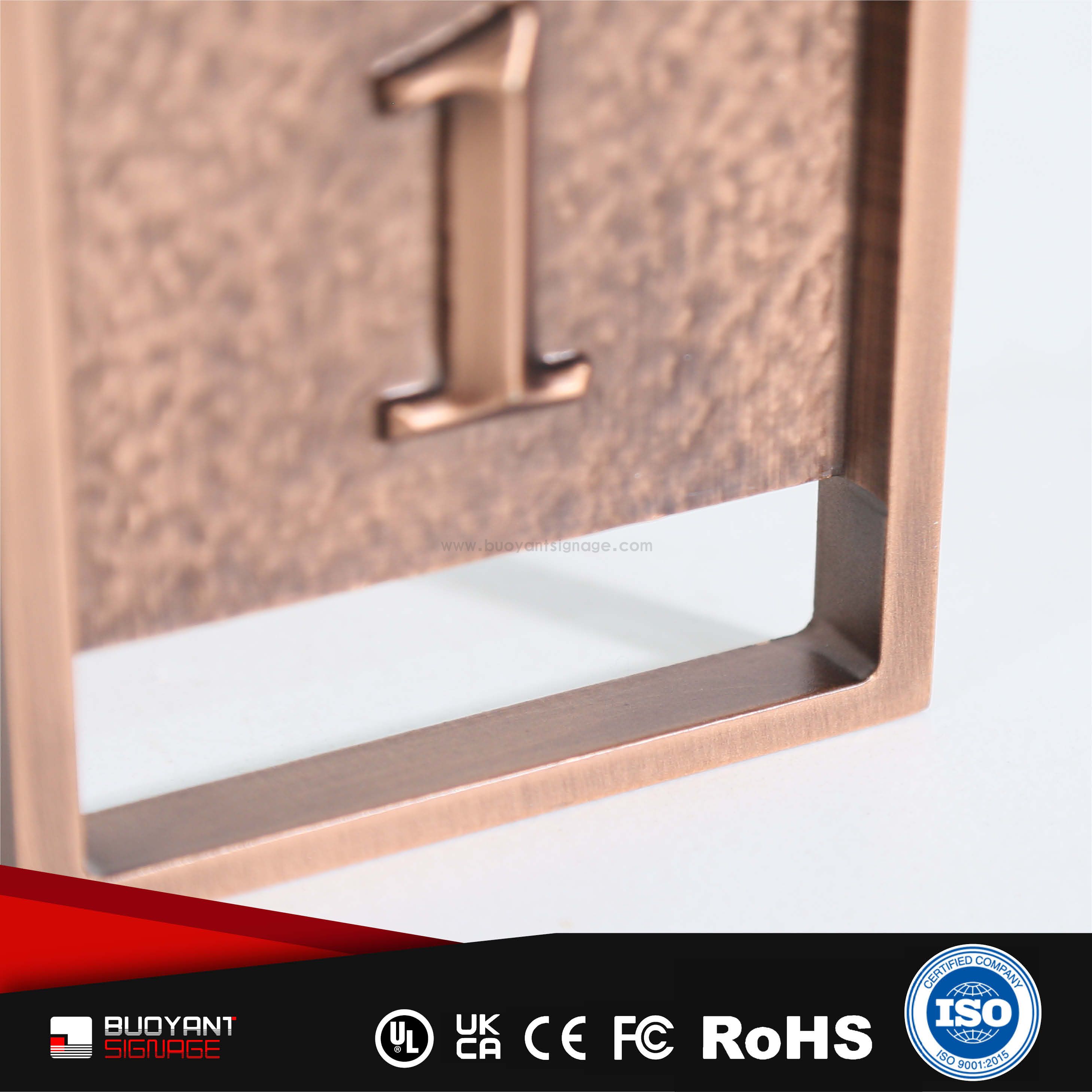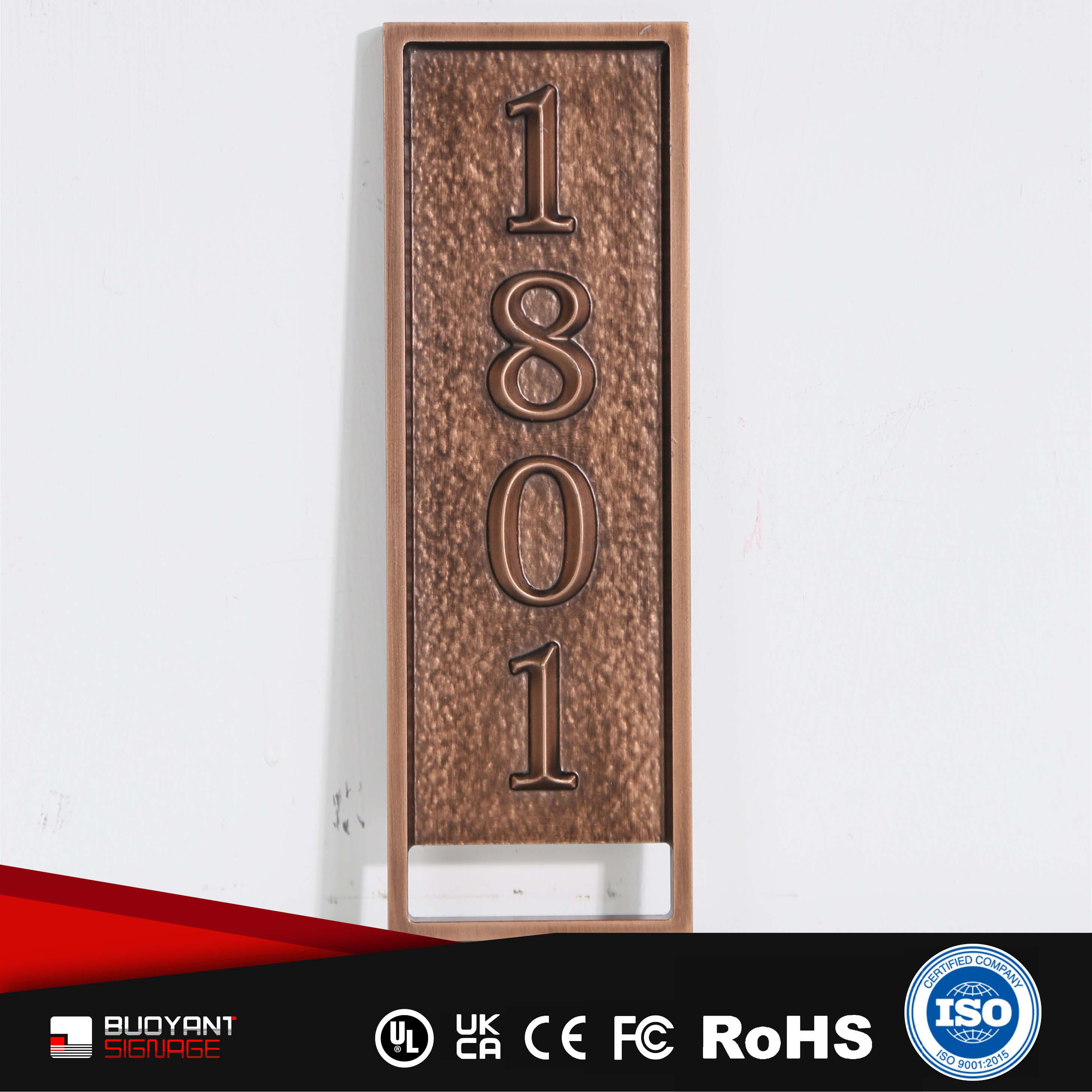 Room number signs are produced using aluminum, acrylic, or stainless steel, supporting bulk and project customization.