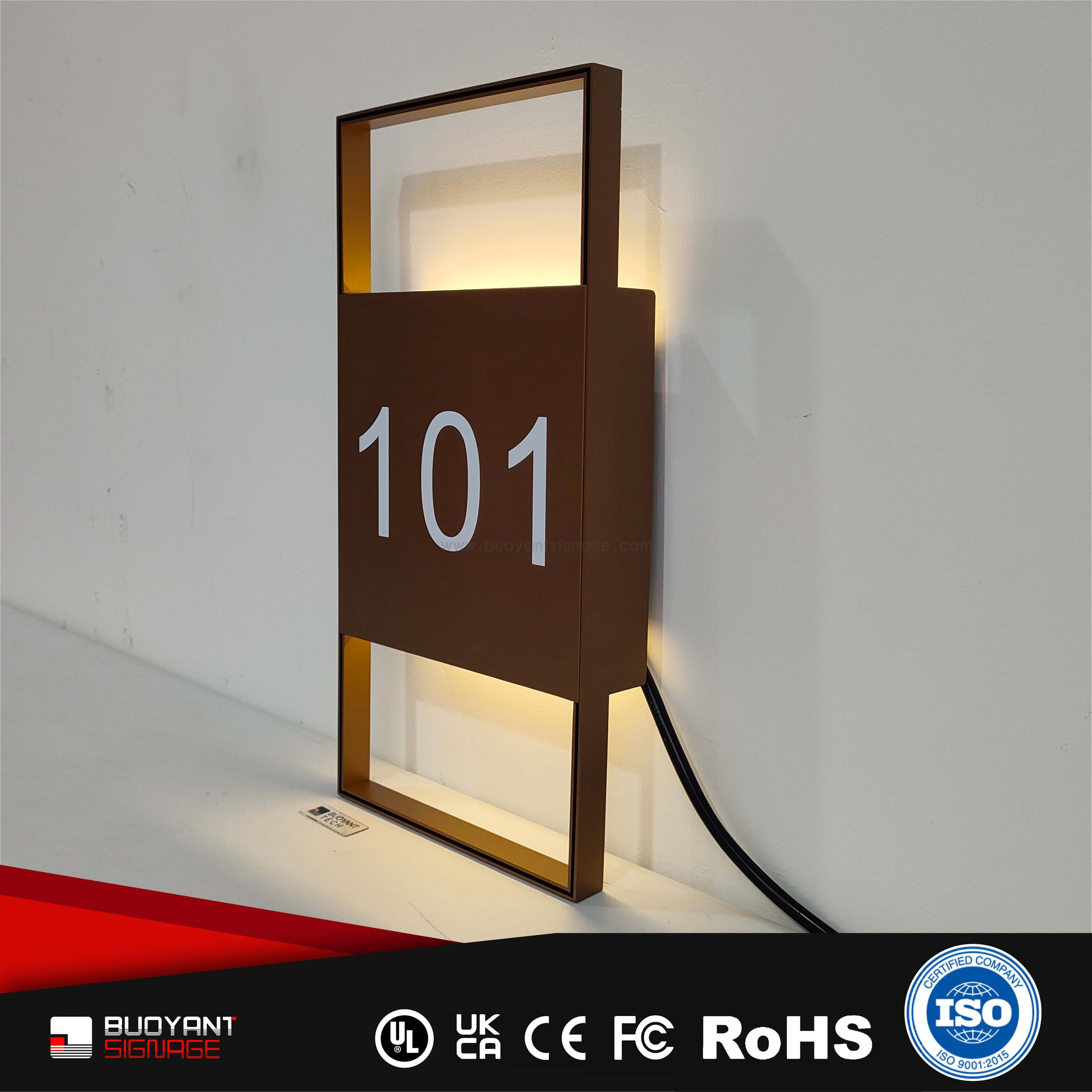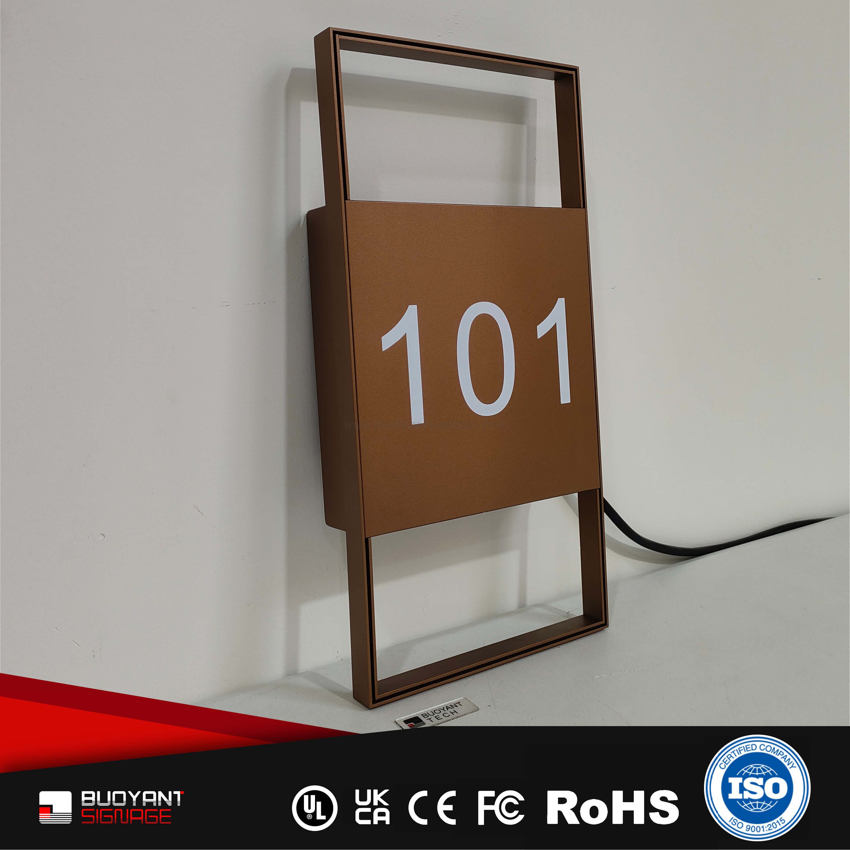 Room number signs are produced using aluminum, acrylic, or stainless steel, supporting bulk and project customization.