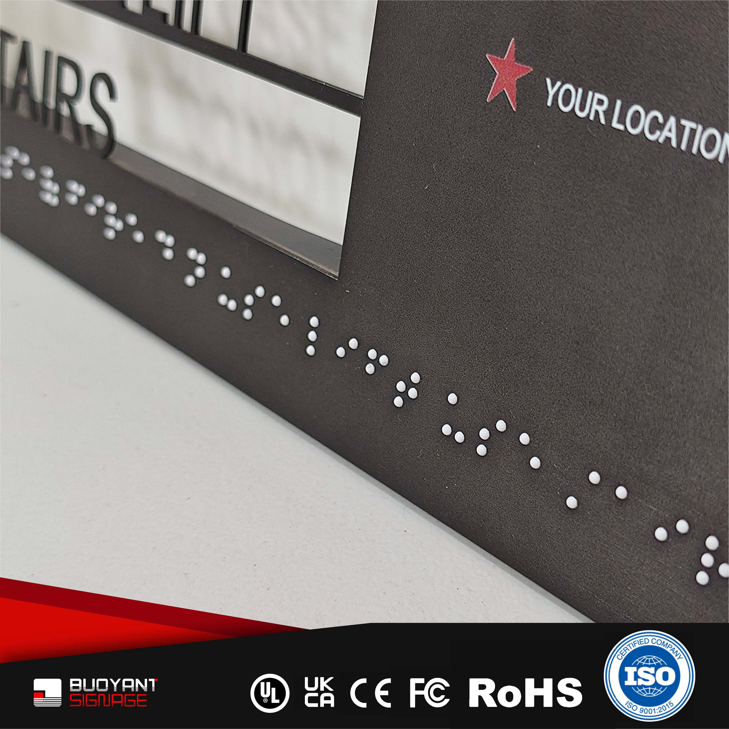 Manufacturing includes raised text production, Braille application, color contrast control, and final inspection.